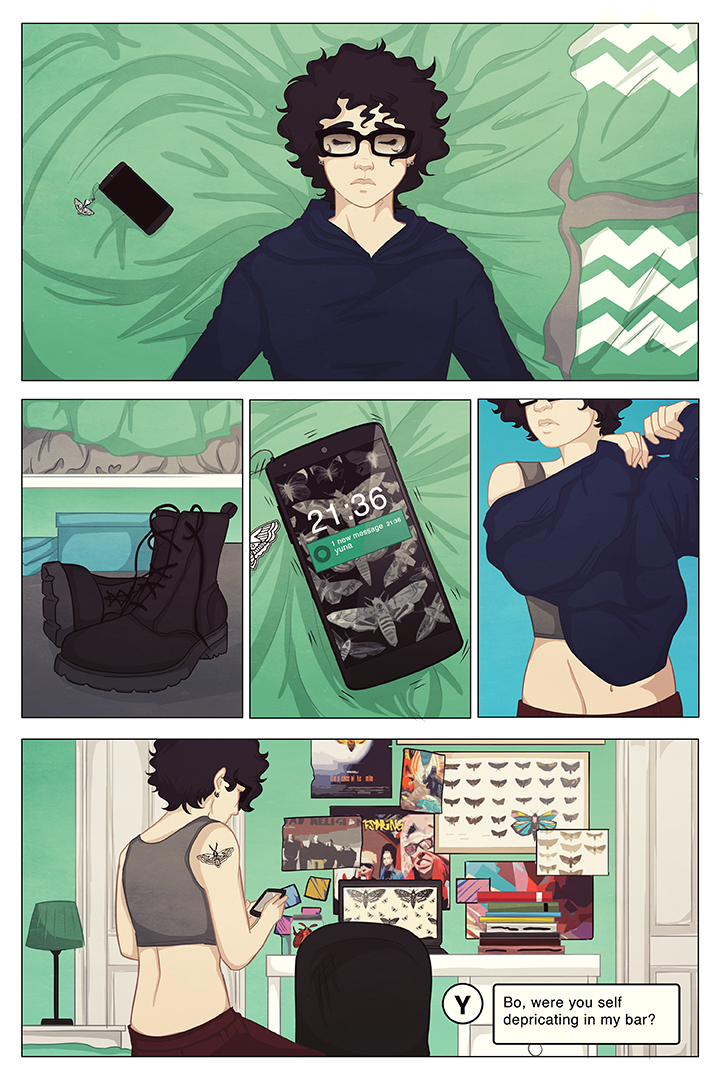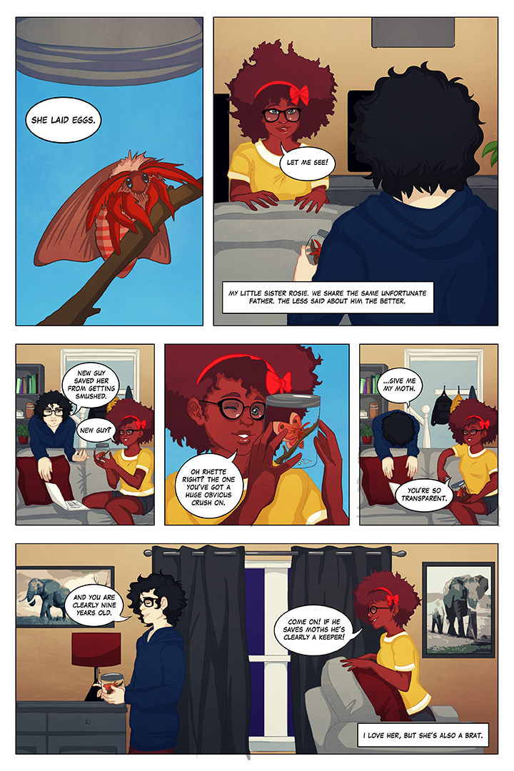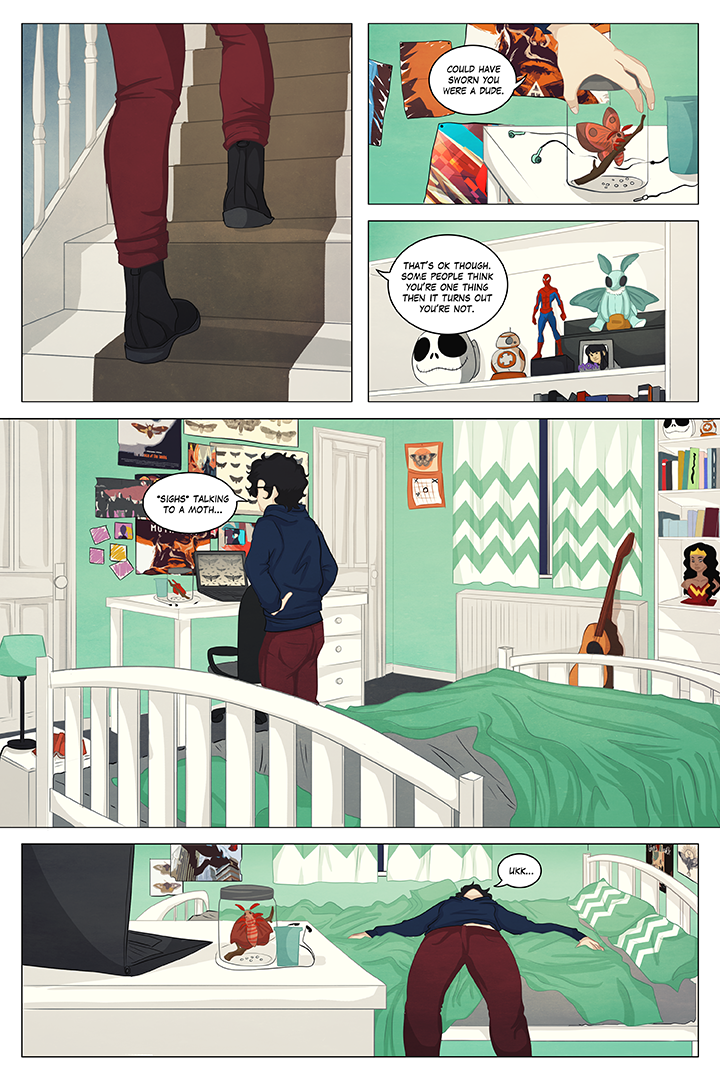 Moth Girl is a slice of life lgbt comic about love through metamorphosis, solidarity through change, and the benefit of being a moth when everyone wants you to be a butterfly.