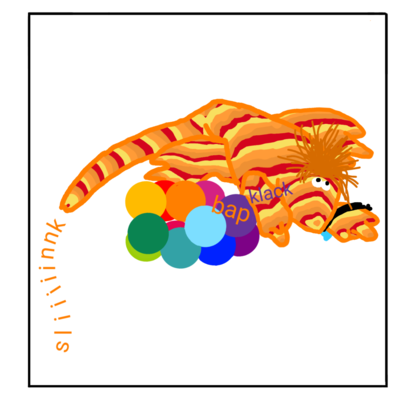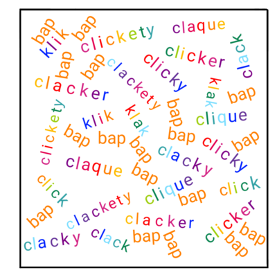 Fourth Panel: Contains a clutter of many many variations on the words "click", "clack", "clackety", "clicky" and so on, in the rainbow colours of the toy, as well as the word "bap" in Mulberry's orange.