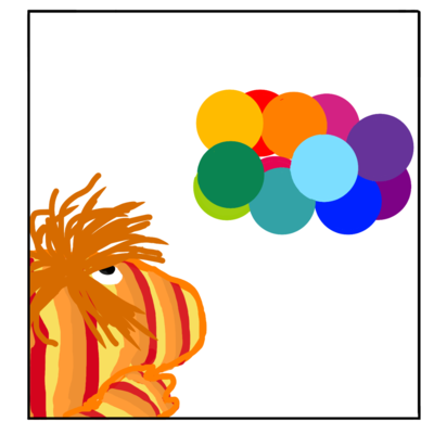Second Panel: Mulberry slinks around the toy and baps it with one foot. The bapped sphere clacks against the next sphere.
