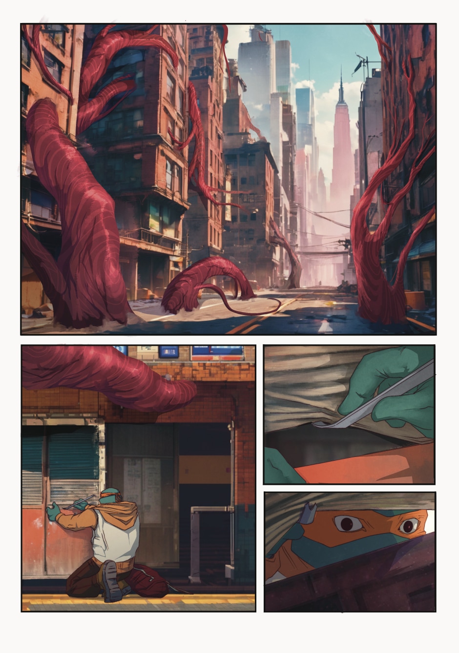 New York City is facing its worst nightmare in history- giant tendrils of the Kraang infest the streets and consume living organisms. Many citizens flee, fewer dare to stay and fight as the forsaken land becomes a ghost town.