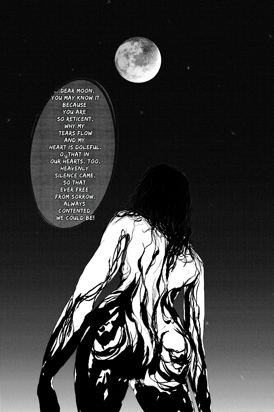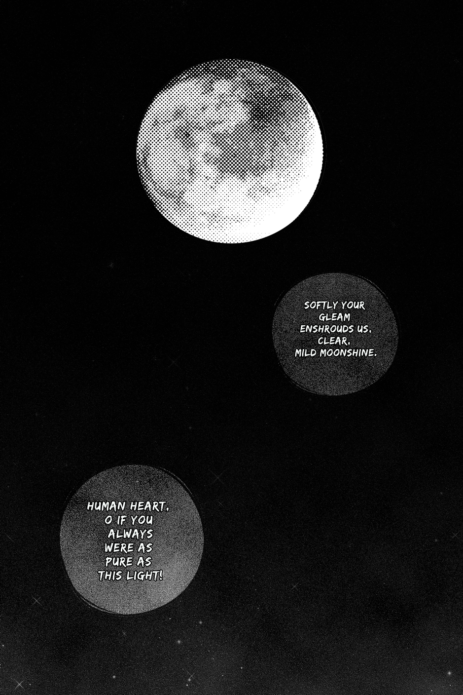 ...Dear Moon, you may know it Because you are so reticent, Why my tears flow And my heart is doleful. O, that in our hearts, too, Heavenly silence came, So that ever free from sorrow, Always contented we could be!