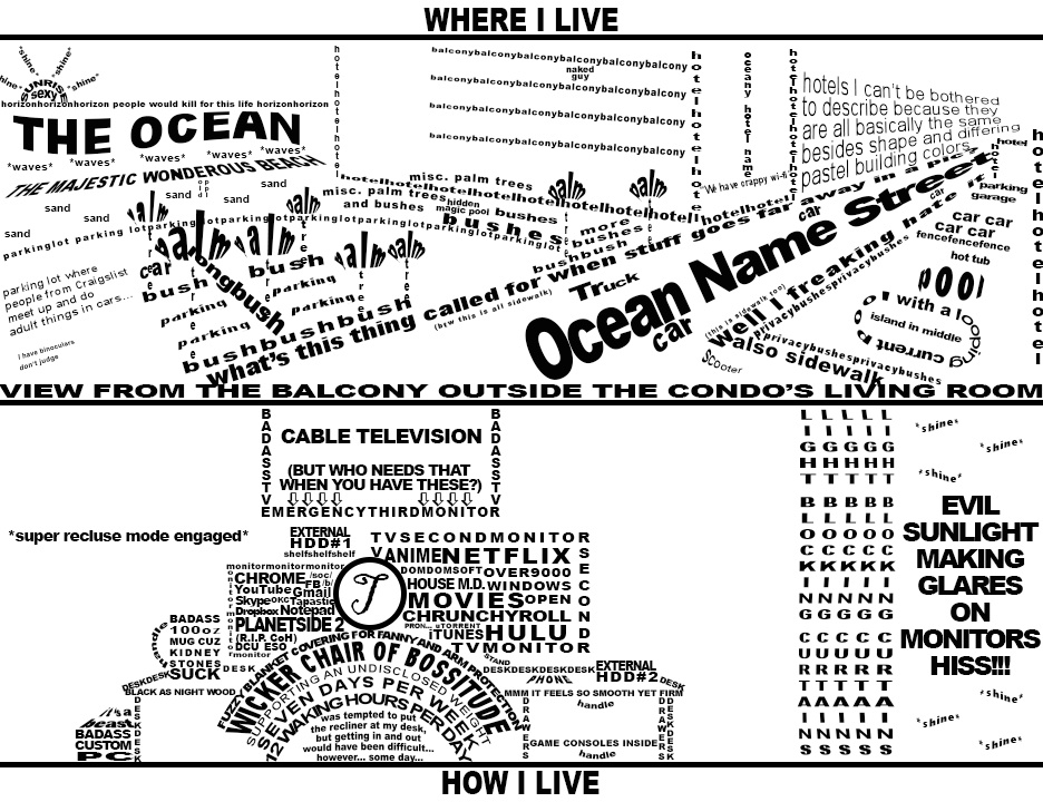 If you have trouble seeing the pictures the words create, try moving back some and looking at the image from a slight distance. My goal is basically to draw a picture with words, but then have the words themselves be (hopefully) amusing on their own.