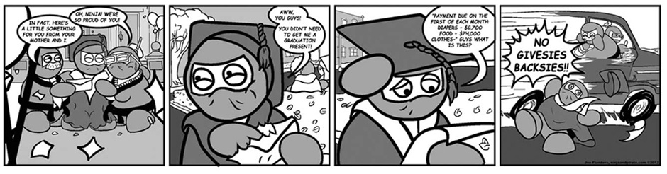 Ninja and Pirate have been roommates ever since Ninja graduated college, however life isn't as simple after school as one would hope. Whether it's falling in love with the Valkyrie next door, fighting with an owl, or getting abducted by intergalactic bounty hunters Ninja and Pirate's life is anything but run of the mill. A mix of character-driven storylines and one-off gag strips, Ninja and Pirate is a one of a kind goofy family-friendly romp that you won't regret guaranteed!*