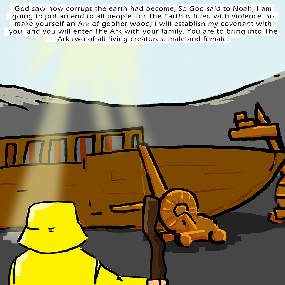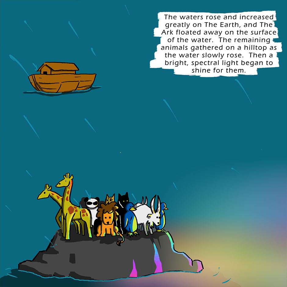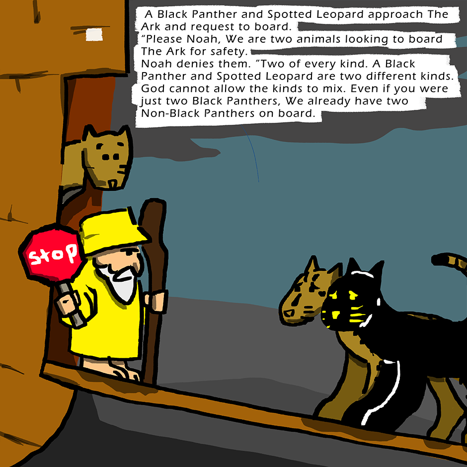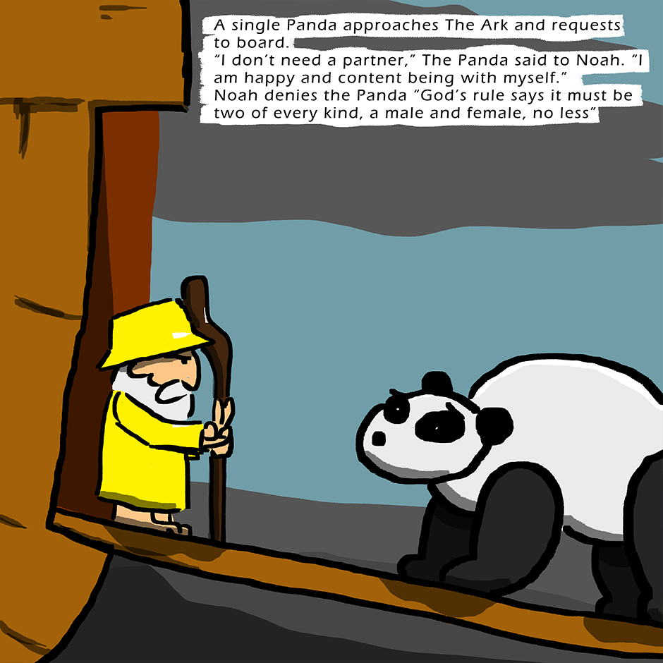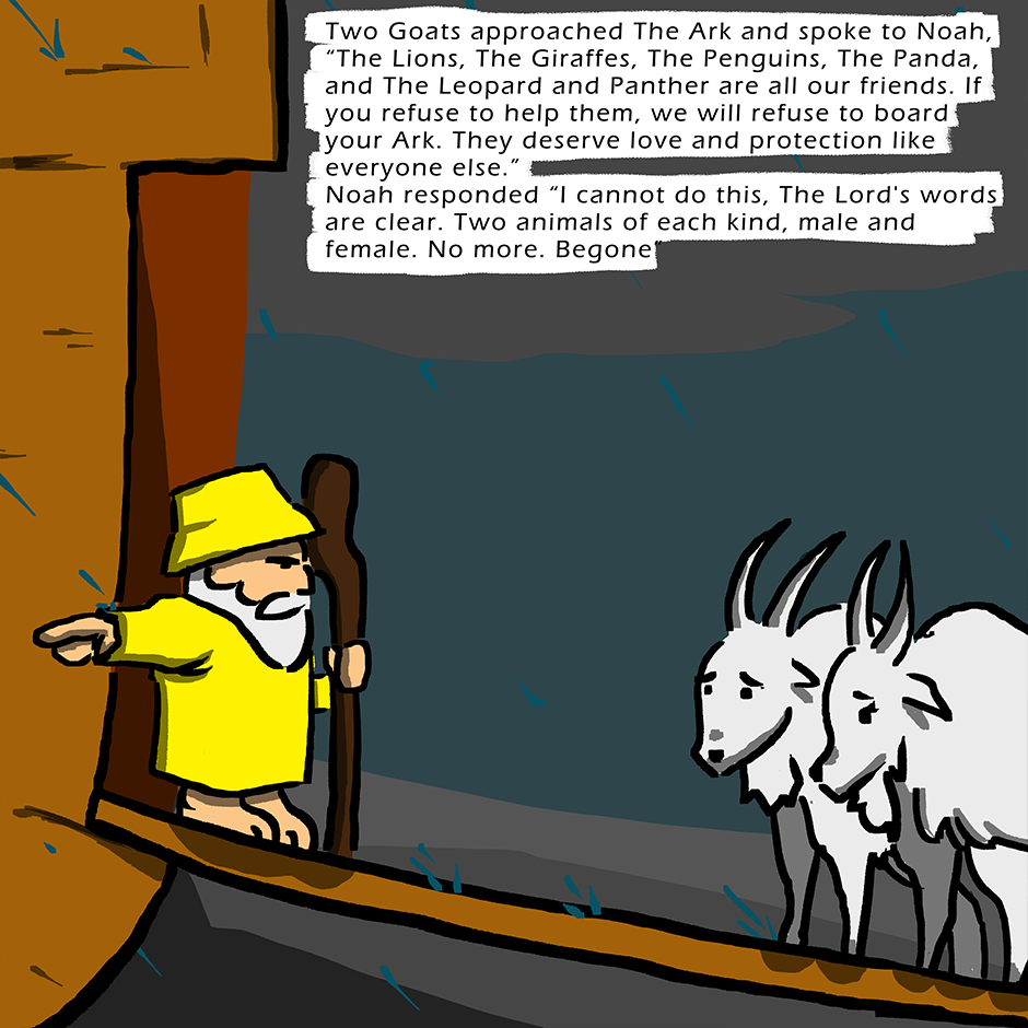 The animals are boarding the Ark to escape God's flood. But what happens when some animals don't fit God's requirements, 2 of a kind, male and female.