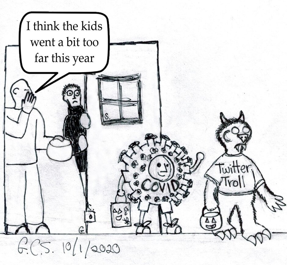 Editorial cartoon previously published in the Fountain Valley News (https://www.epcan.com/). A look at some of the odd trick r' treaters we saw in the 2020 Halloween season.