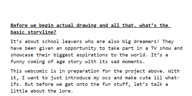 Making this comic in prep for the big project! Features traditional on-paper work, info on ocs and the storyline, alongside funny what ifs and practice comics to show interactions.