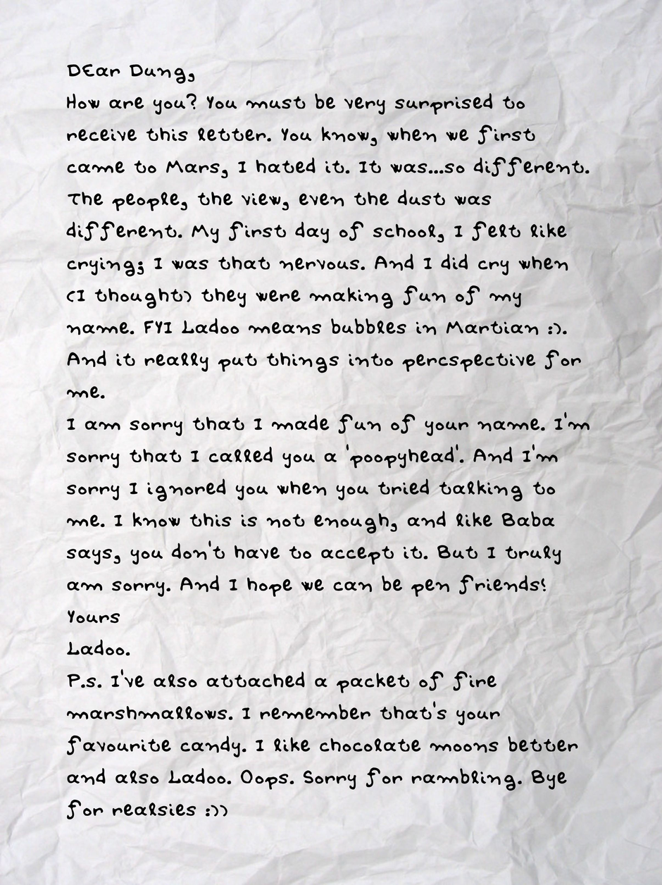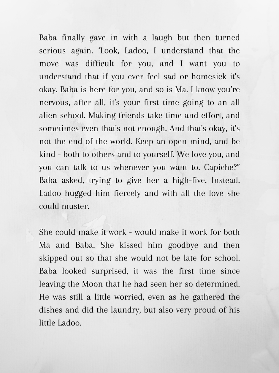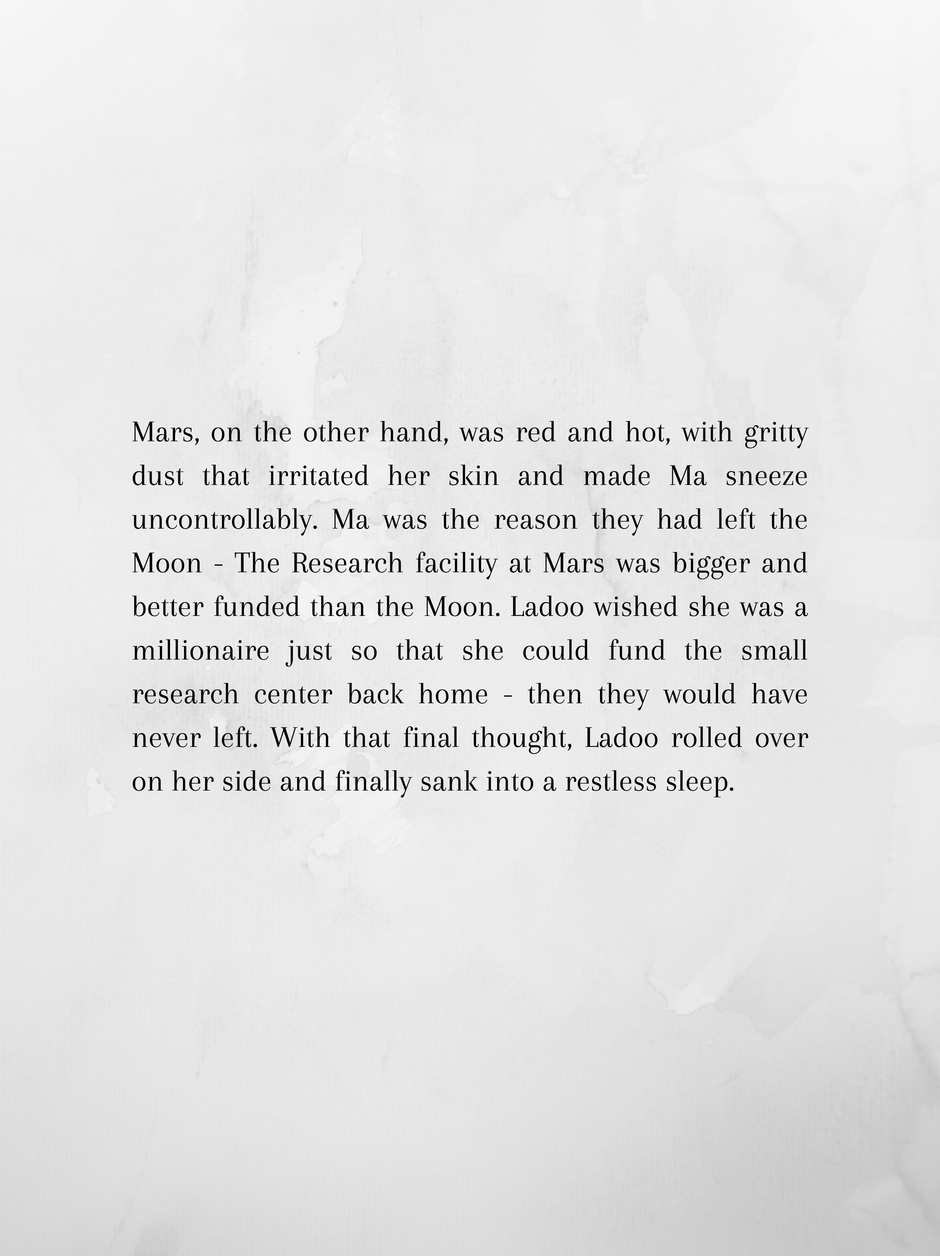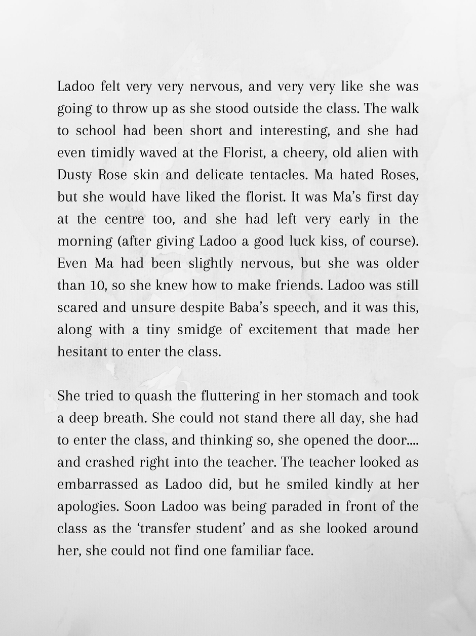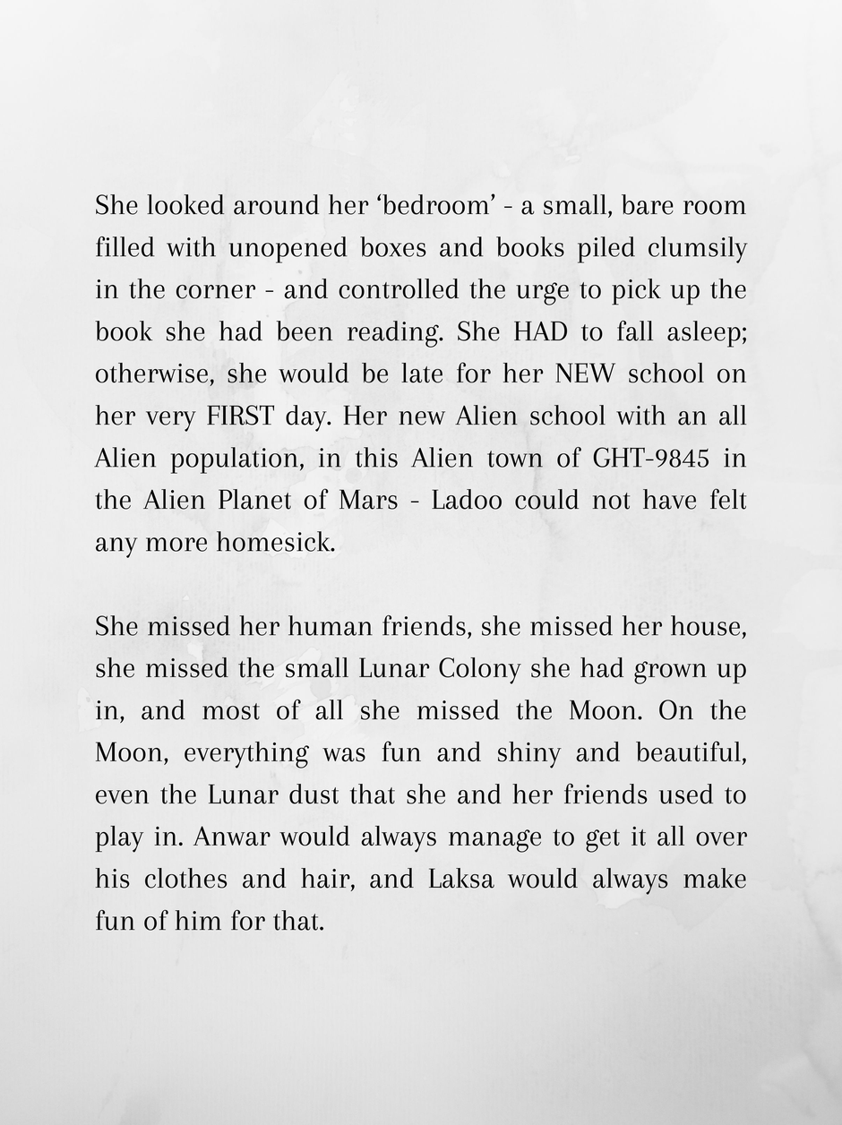Ladoo is 10 and wishes she was back home at the Moon. Mars is hot and dusty, and between that and her being completely friendless and out of her depth in an all alien school, she dreams of reversing the past.