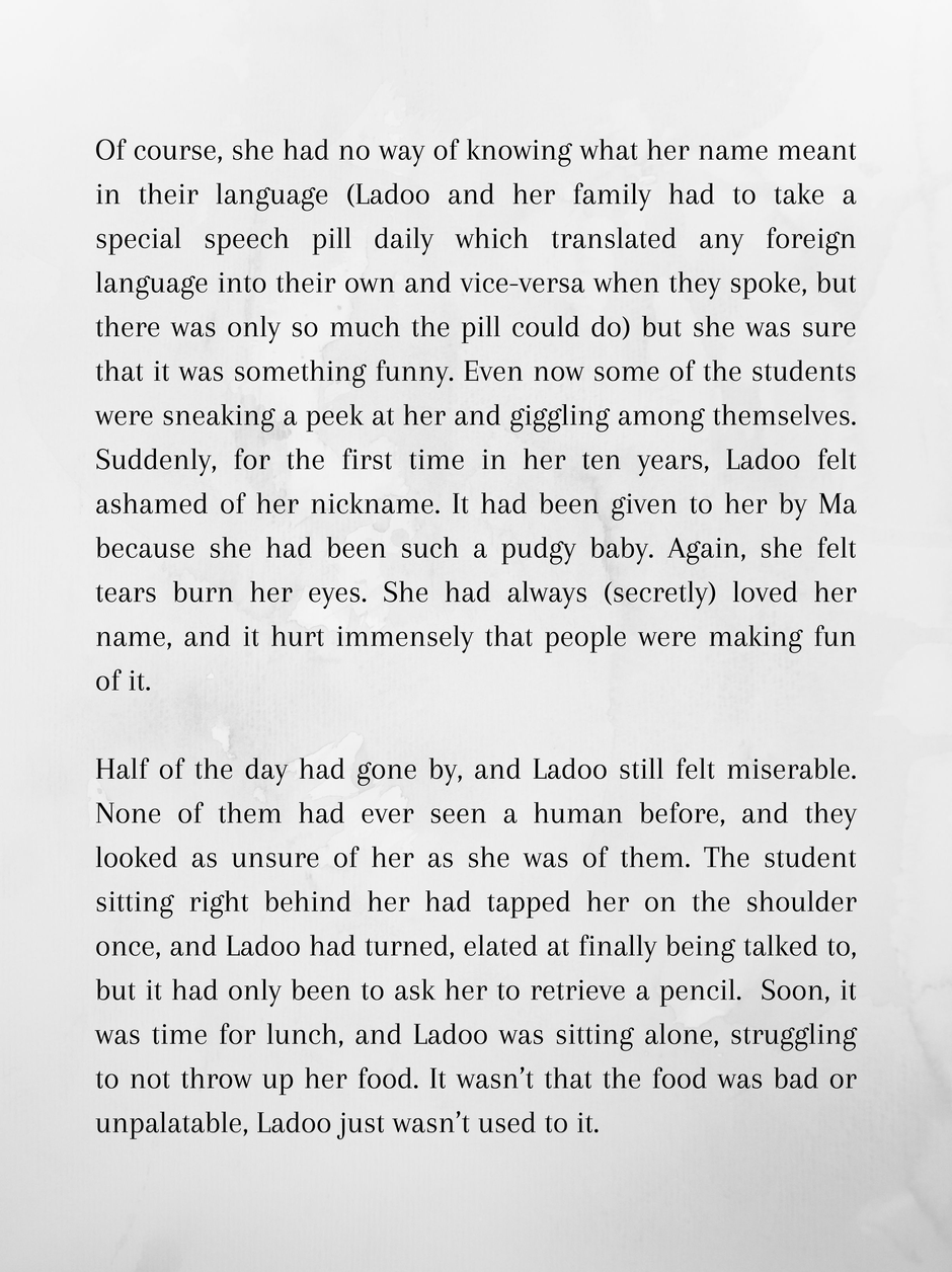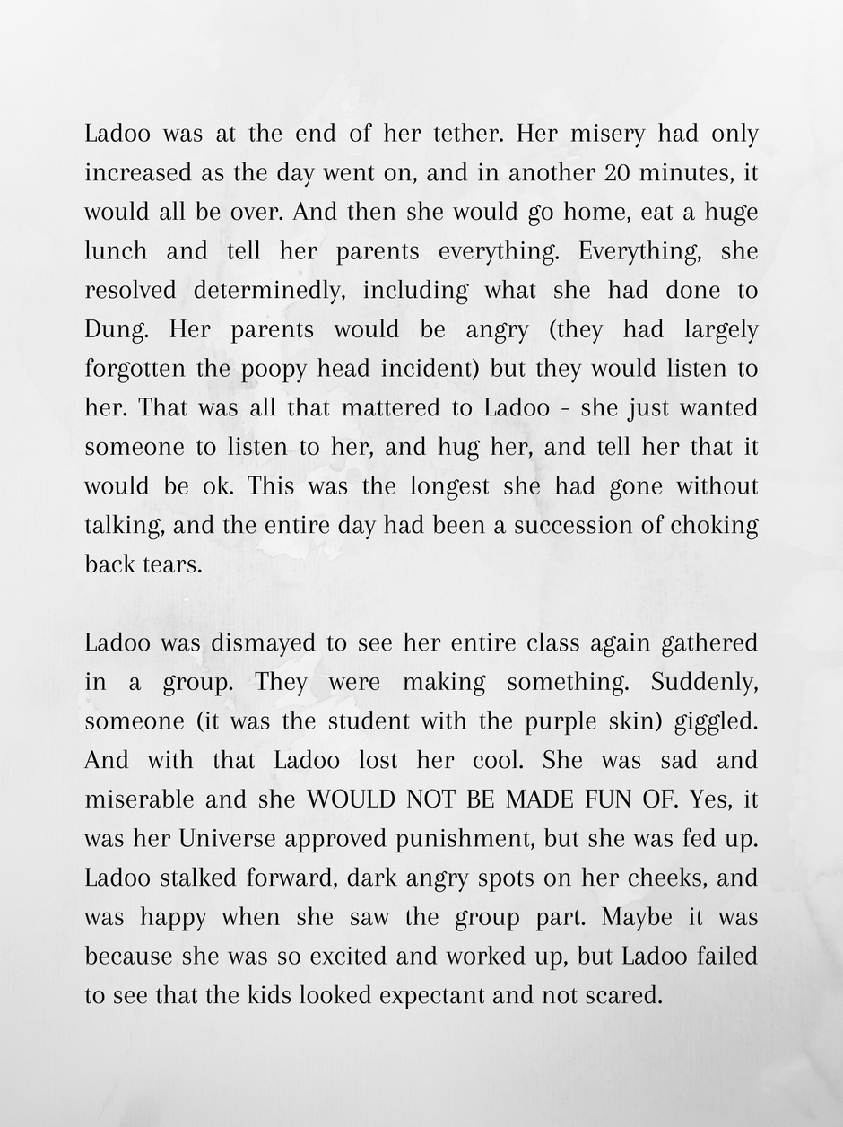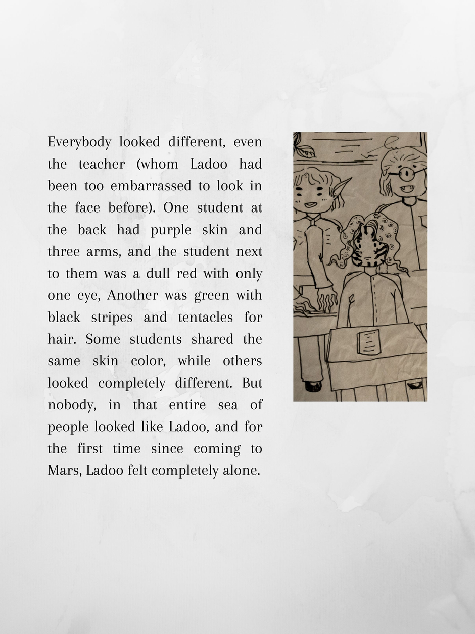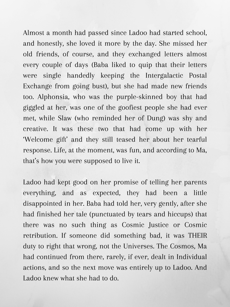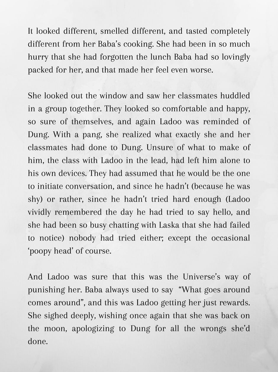 Ladoo is 10 and wishes she was back home at the Moon. Mars is hot and dusty, and between that and her being completely friendless and out of her depth in an all alien school, she dreams of reversing the past.