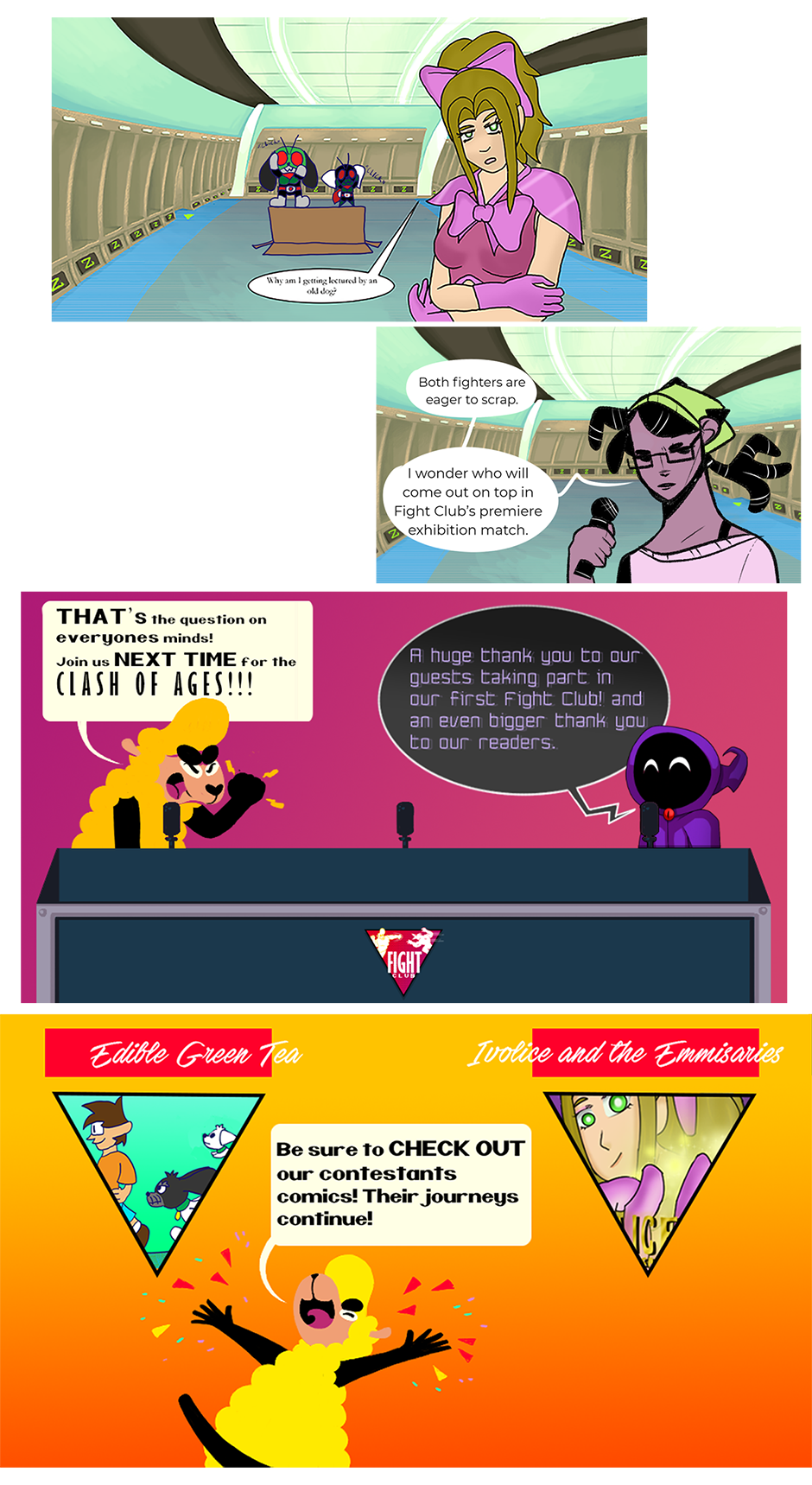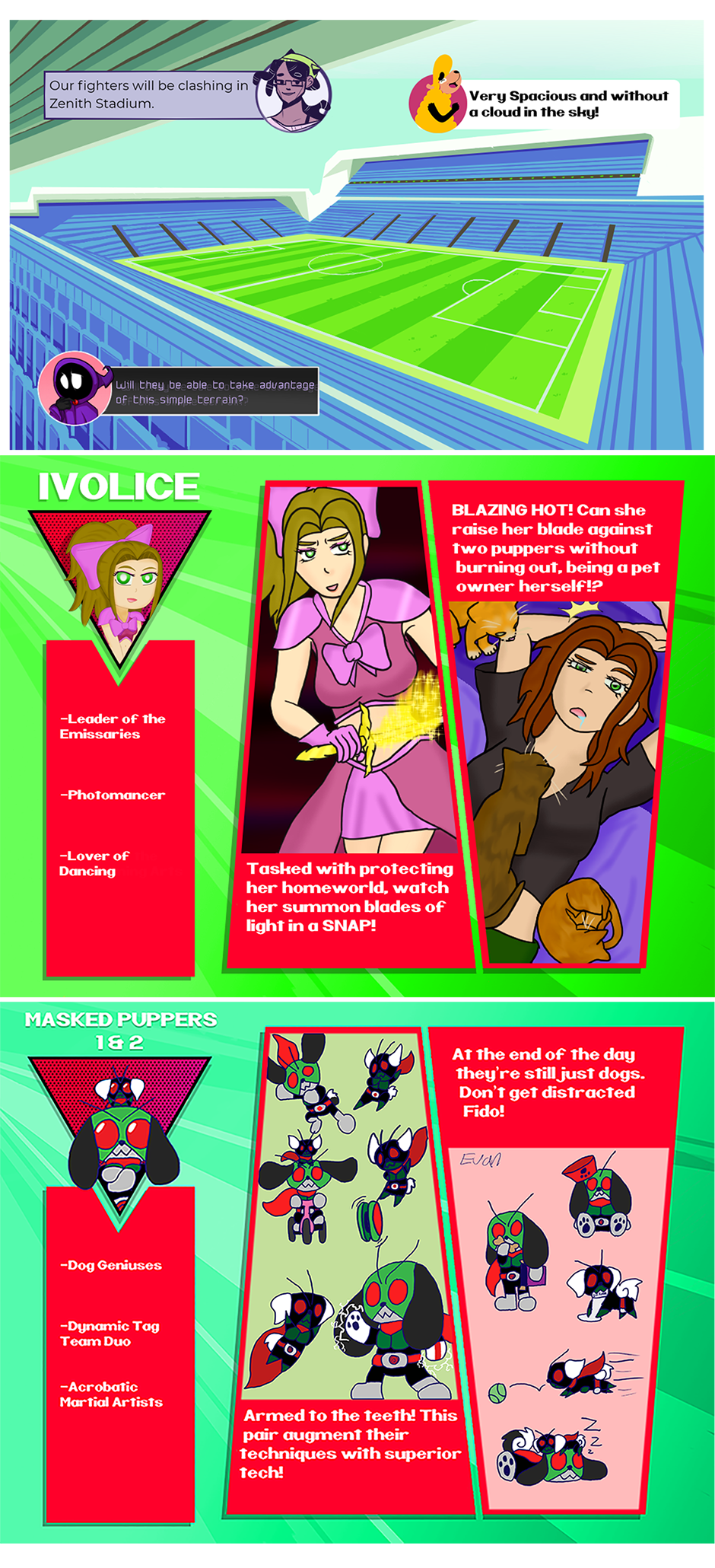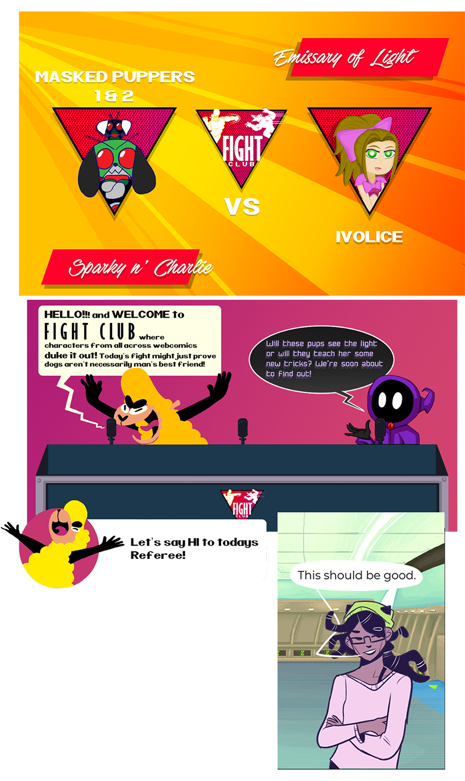 The introduction of our fighters and the fighting arena! Stay tuned for the full bout between these two genius dogs and a lovely photomancer! Vote on our strawpoll on who you think will be our winner! www.strawpoll.me/16295863 Here are the links to each fighters comic! Ivolice: tapas.io/series/Ivolice Masked Puppers: tapas.io/series/Edible-Green-Tea Follow the contributors of our first ever fight! Korean Tacos: tapas.io/KoreanTacos Ghostieblu: tapas.io/ghostieblu DawgofDawgness: tapas.io/dawgofdawgness Aqua03: tapas.io/aqua03