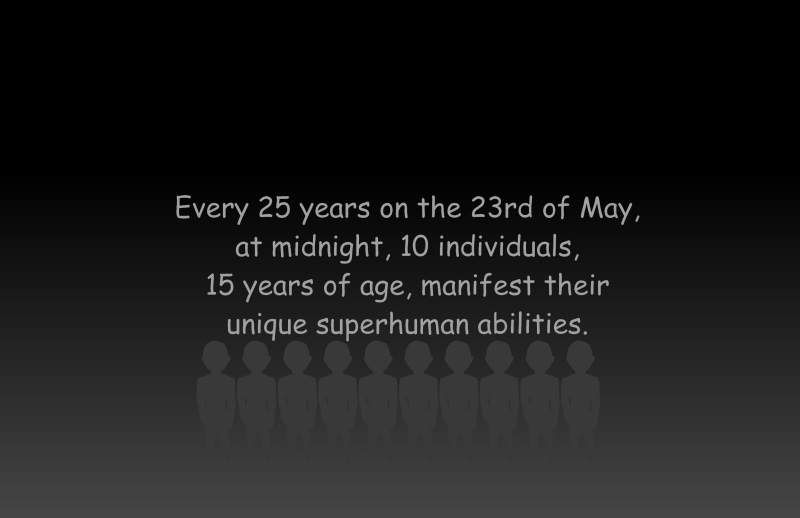 Every 25 years, on the 23rd of May, 10 random fifteen-year-olds gain strange superpowers. It's been 75 years since the first occurrence, and the fourth generation is about to learn their special abilities. Will these teens be able to hold the responsibility of the fate of the whole world?