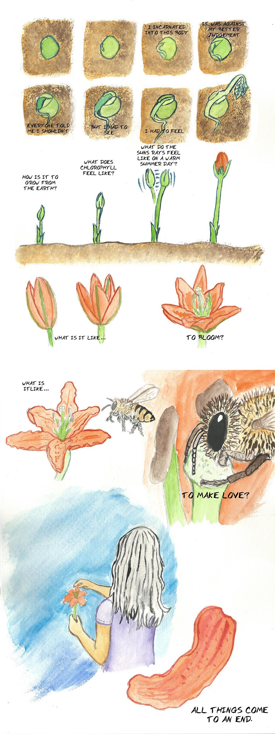 This is about reincarnation. Not necessarily the traditional Buddhist or Hindu version. I read about a man who went to heaven. He talked about a lot of things. One of those things was about people (or the disincarnate energy of former people) reincarnating not only as humans but also as things like rain drops and all kinds of other things. Just for the experience. This is a soul incarnating the body of a flower.