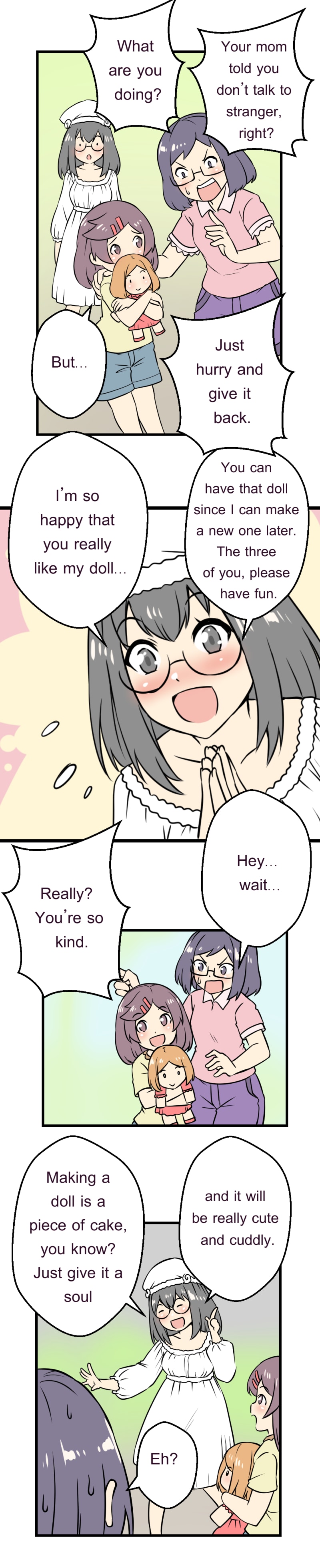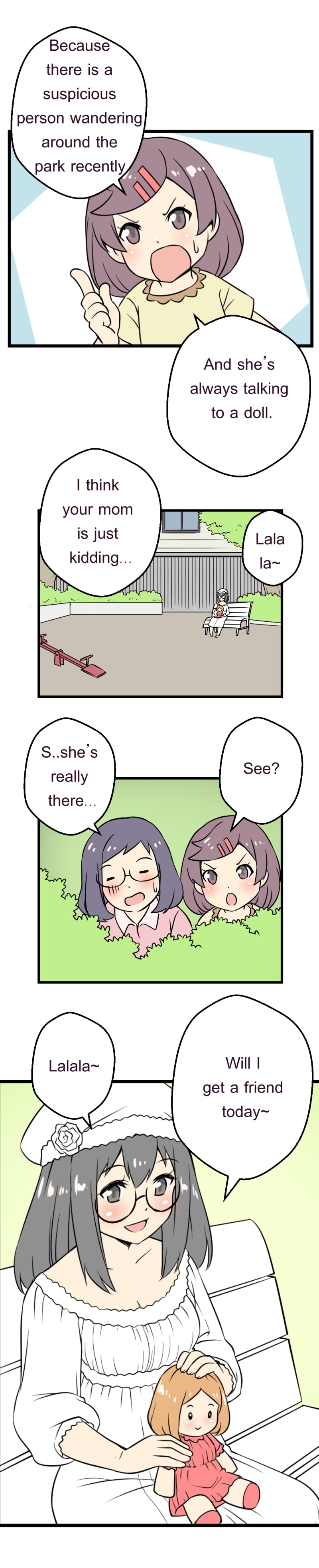 The mysterious little girl in white dress and very cute handmade doll. She wants some friends, who like her dolls. She will give it to them. After that, its happened.