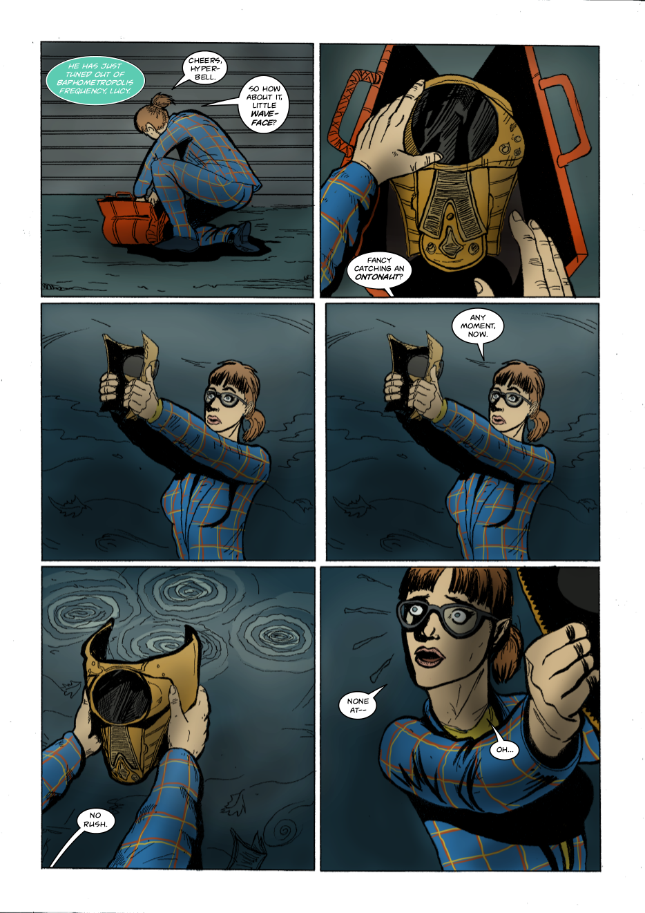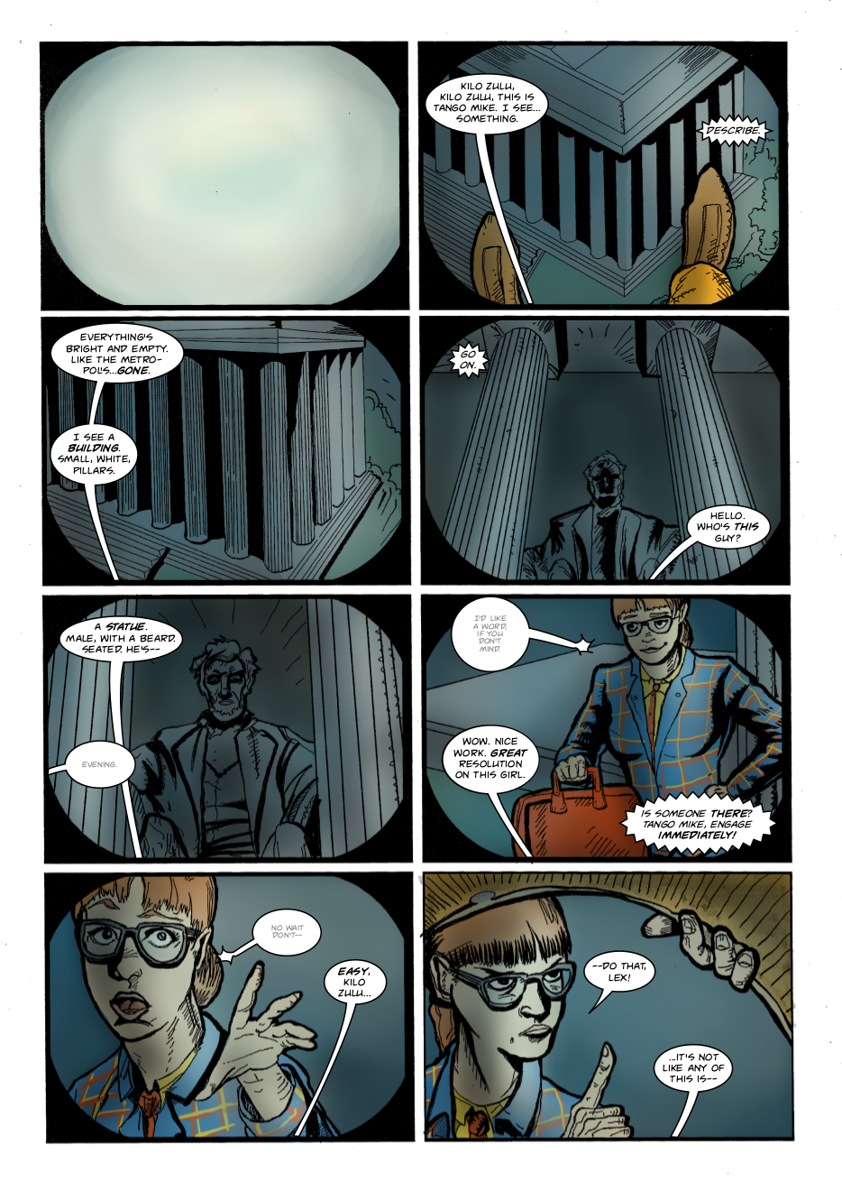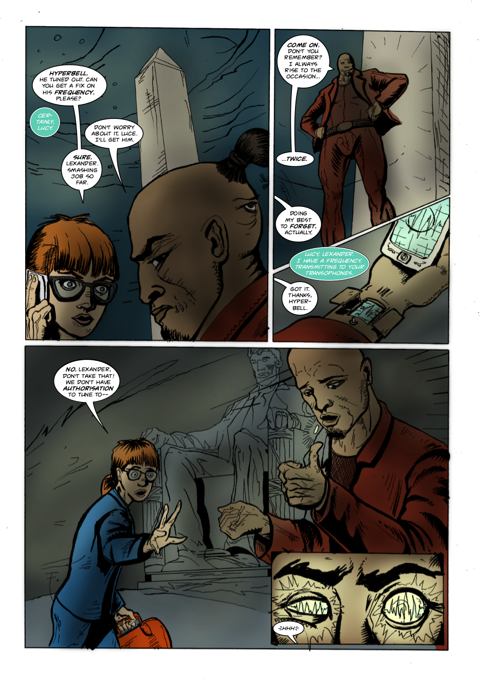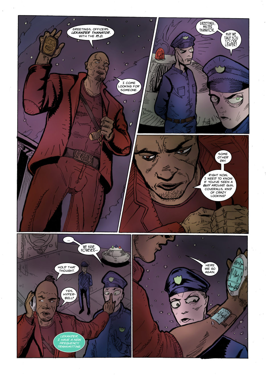 Interdimensional spies Lexander Thanator and Lucy Xennon chase a mysterious stranger across realities. Script: Lars Schwed Nygård Pencils & inks: Laszlo Seber Colors: Seth Piper Inks: Eric Jones