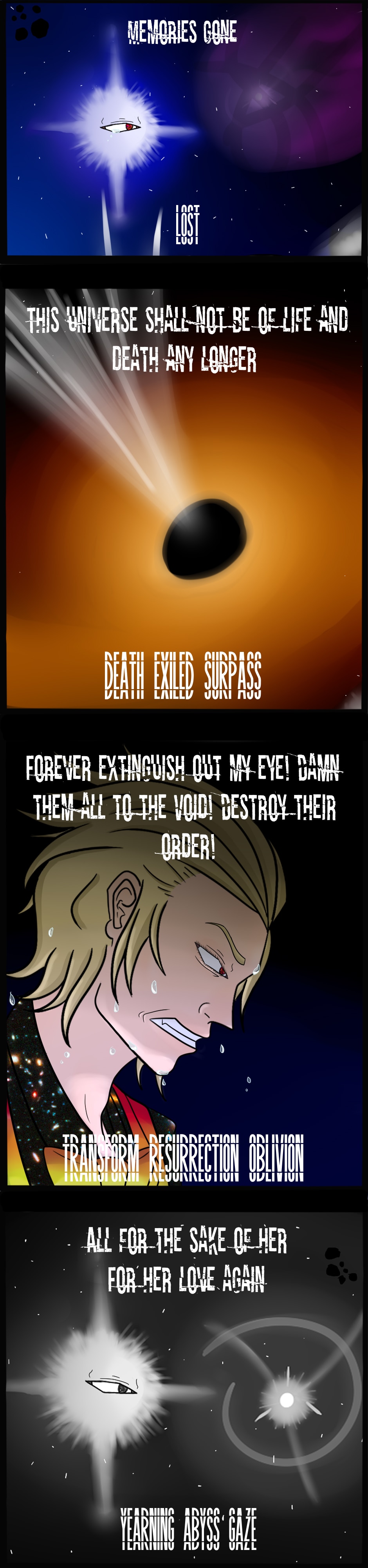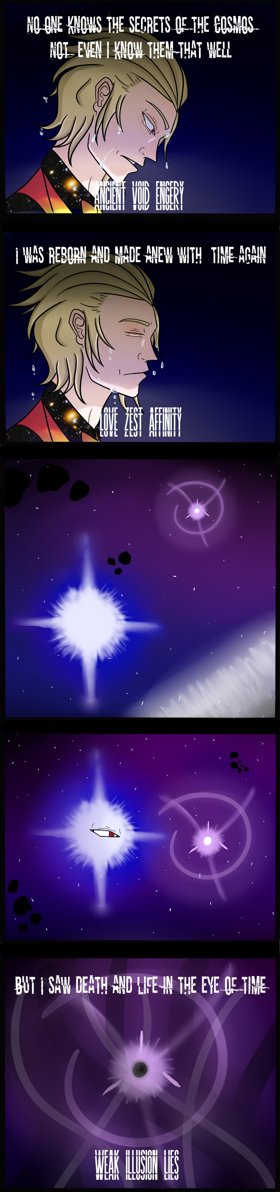 A small light caused a big bang that created elements, entities, and forces. This small light was filled with love and hope to his creations, until the cycle of life began. This new start of birth filled the entity with hatred and destruction. For it led the death and reborn of Time. This small light was known as The One.