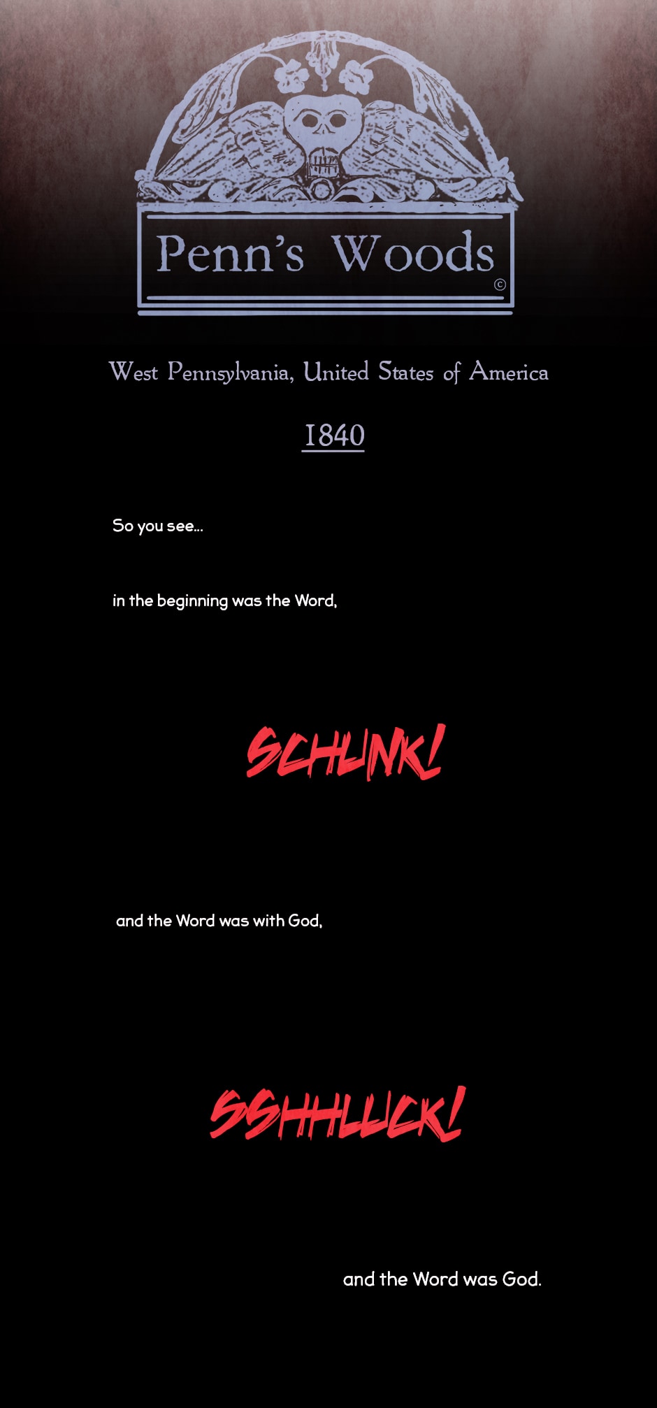 Here is the prologue to 'Penn's Woods' and a small introduction to Reverend Roderick Parris and Rachel Hart.