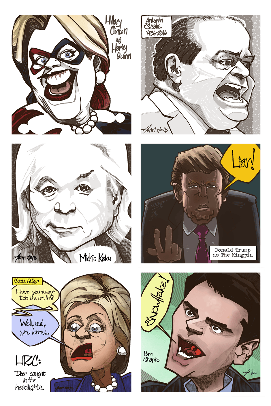 Political cartoons are not mirrors, gargoyles or harbingers of doom. No, political cartoons are grade-school taunts, heckles, hectors and giggles that on occasion raise to the level of low art. I can't say that about my comics. I often do not try for humor. Politicians of all stripes and public-people terrify me for their absurdism, megalomania and stupidity. For me, my cartoons depict my perceptions of the people who would rule us.