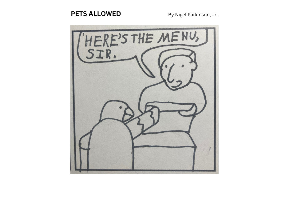 I have added three more panels to this comic strip! For those who wanted to know what is on the menu, there you go. I hope you enjoy and I look forward to more views, likes and comments for this comic strip, "Pigeon".