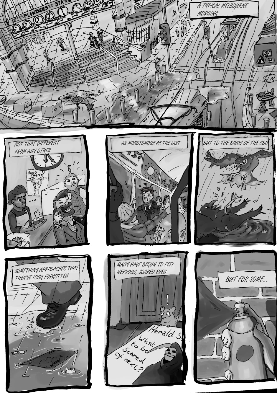 The lives of Melbourne pigeons are not what they seem. Forgotten gods are becoming not so forgotten. The fragile treaties between birds are getting broken. And worst of all, Rob still can't get a girlfriend!