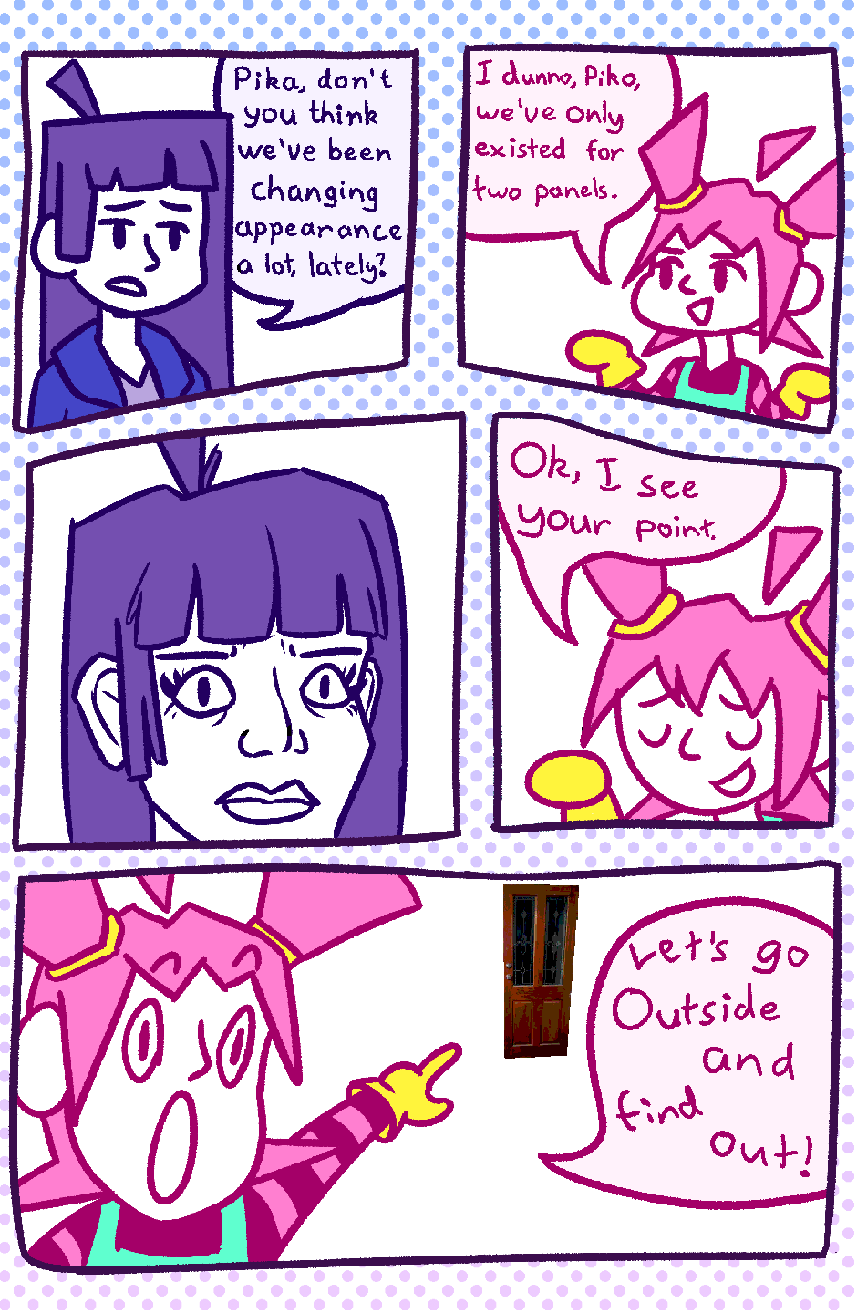 Heyy! Welcome to my silly comic where the art style changes every panel! I made this because I wanted to have fun with experimenting with art styles! I hope you like it! I have a few more pages made, so I will upload those shortly!