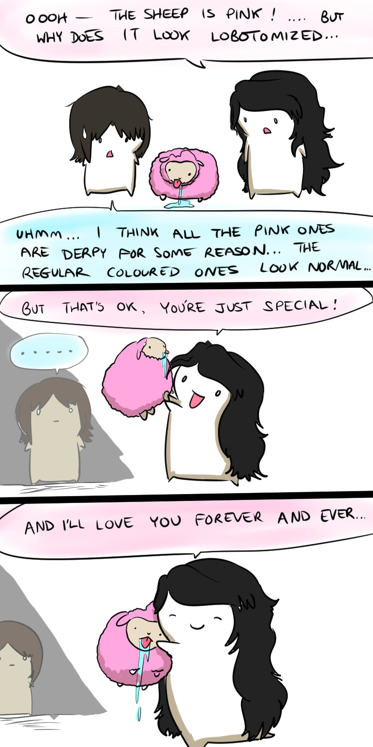 Around Easter, this store I used to work for sold these adorable sheep plushies....except all the pink ones have a dent on their heads and they just look really derpy--and it's only the pink ones! So I bought it for a friend....she seemed apprehensive at first, but she warmed up to it.