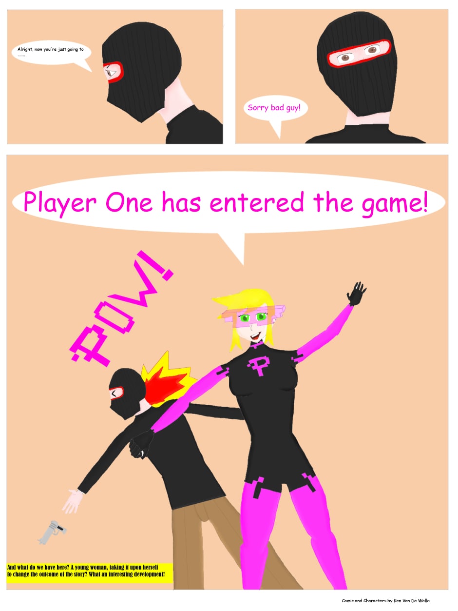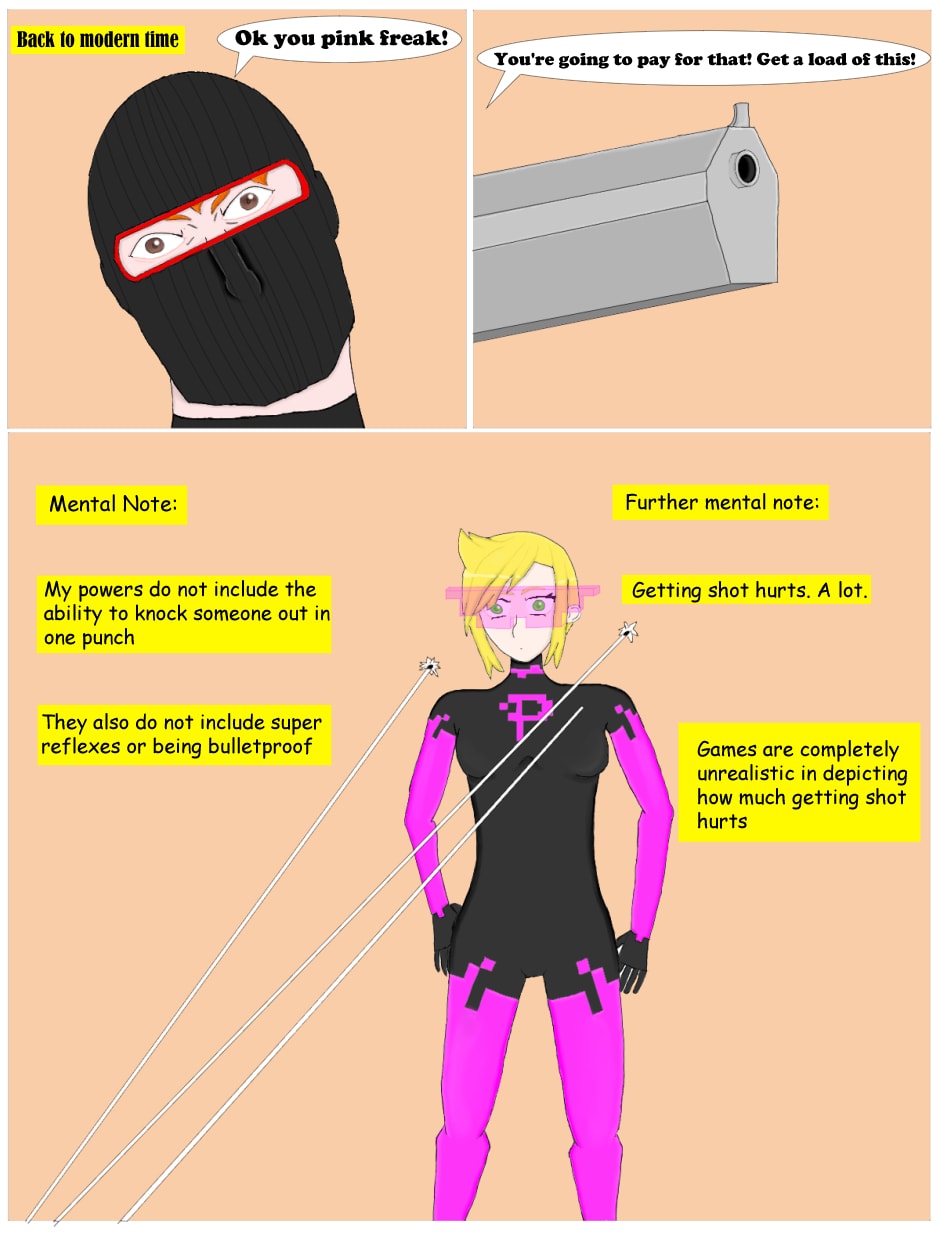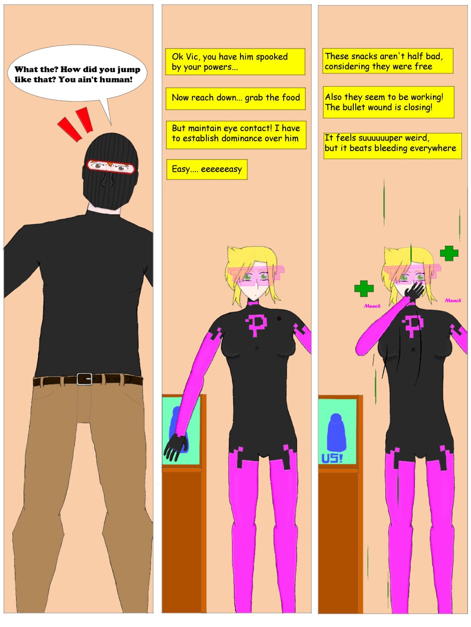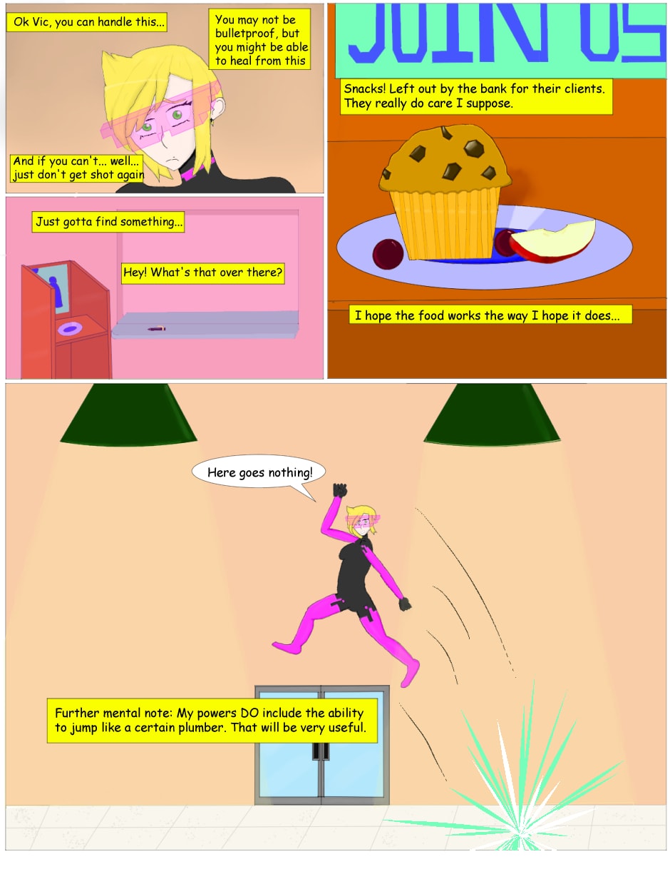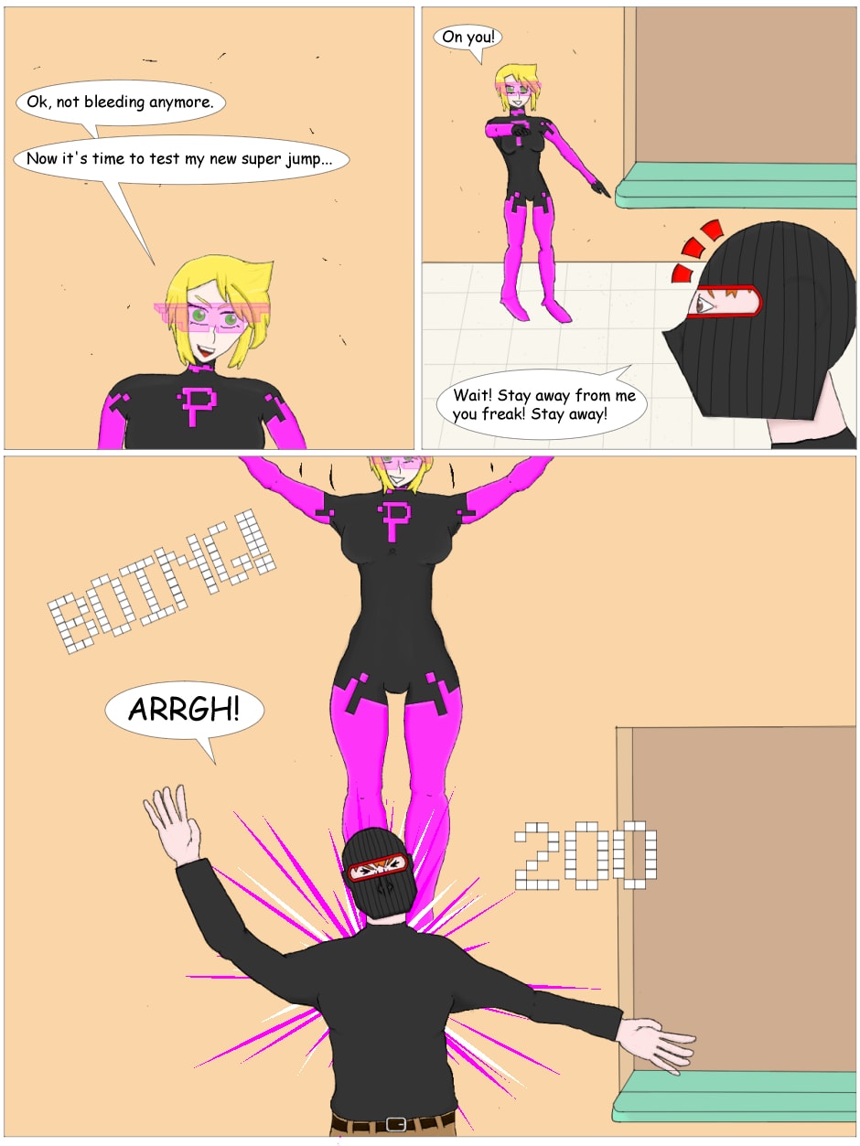 A brand new comic featuring a superhero with a fun twist! She can jump incredibly high, eat to recover health, and more! If it makes sense in a video game, you can bet that Pixel can do it!