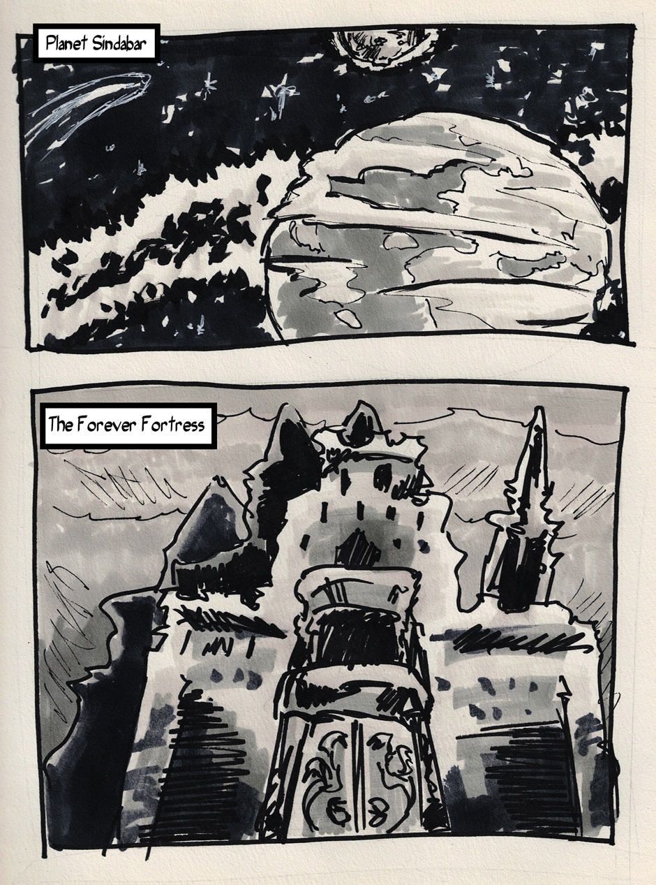 I had a shower idea of just drawing a comic with no plan ahead and see how far will I go. And I immediately pictured these two panels in my mind.