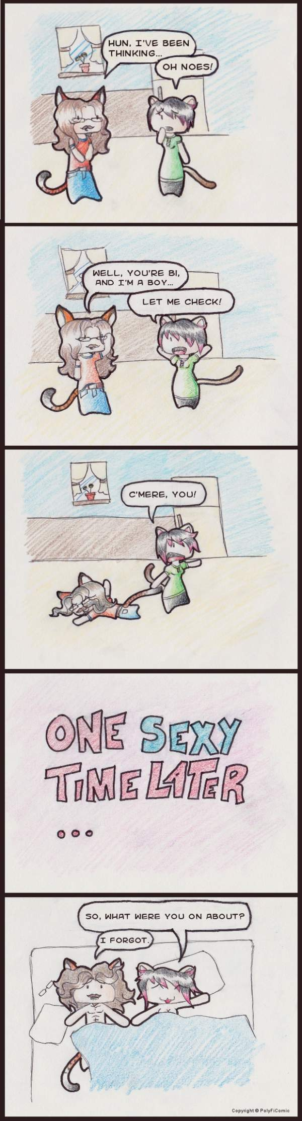 PolyFi is a comic about the almost-true adventures of a polyamorous triad. It shows that love comes in many forms. PolyFi also doesn't take itself too seriously; you don't have to be poly or LGBTQIA to enjoy it (but it helps!)
