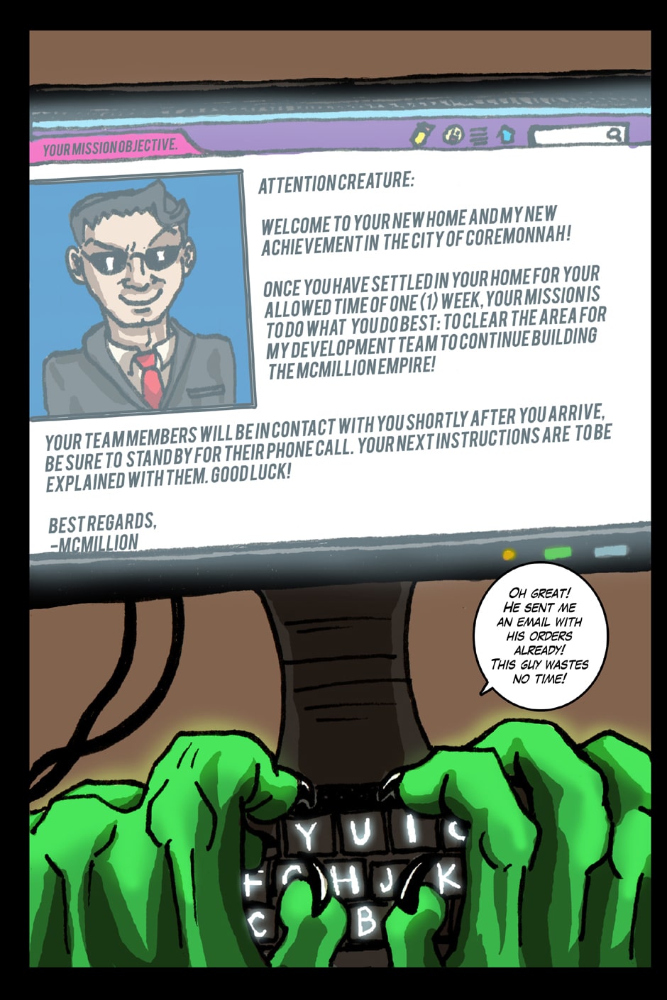 One day, code name 'Creature' comes crashing down in the town of Coremonnah, employed by the rich and powerful McMillion in a mission