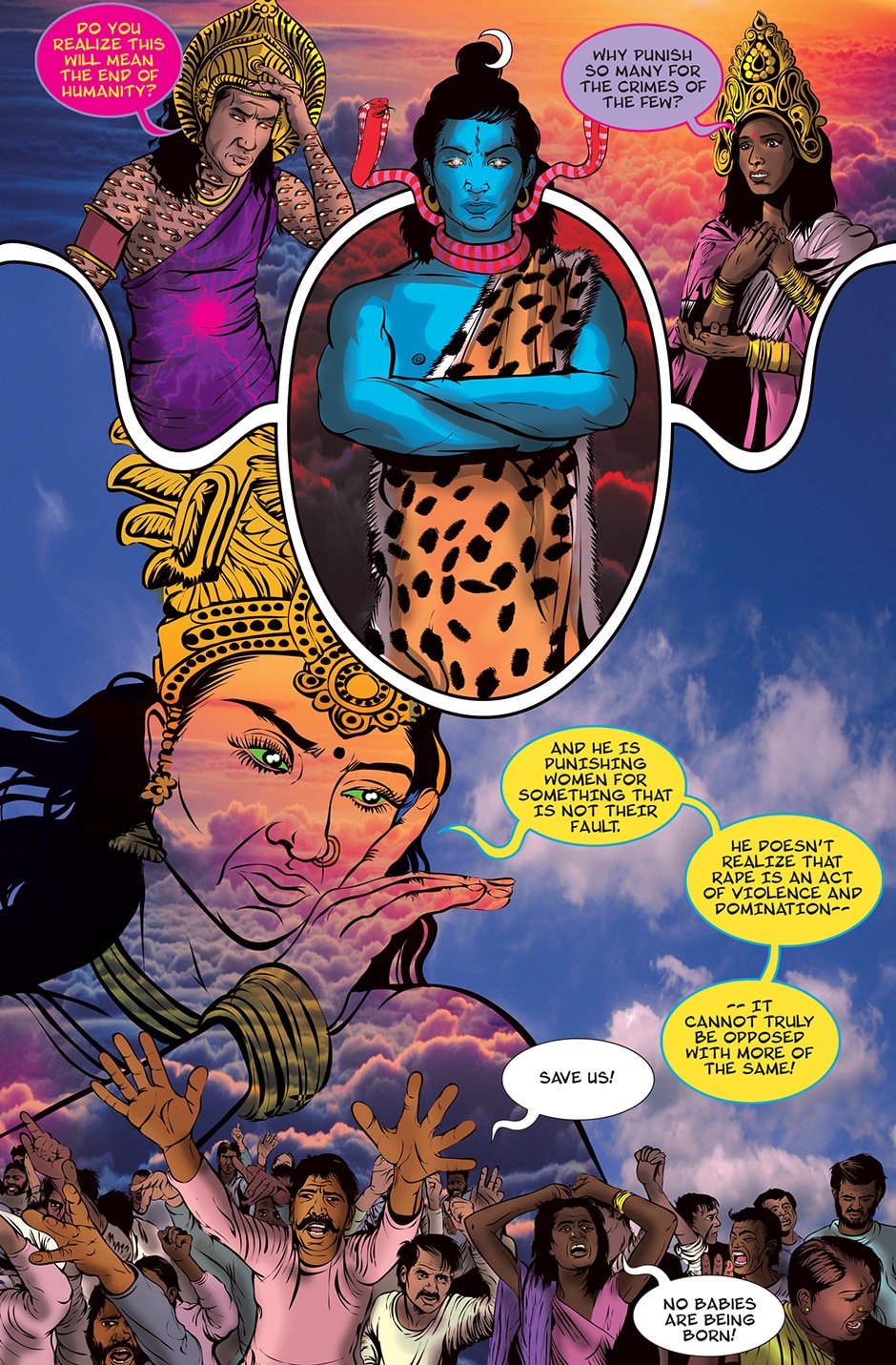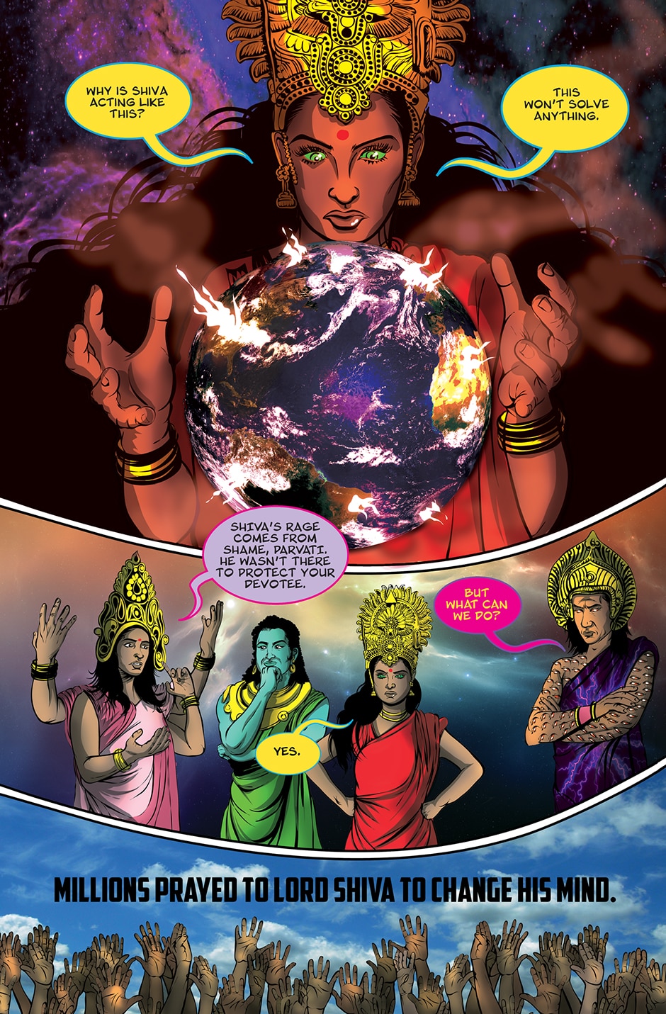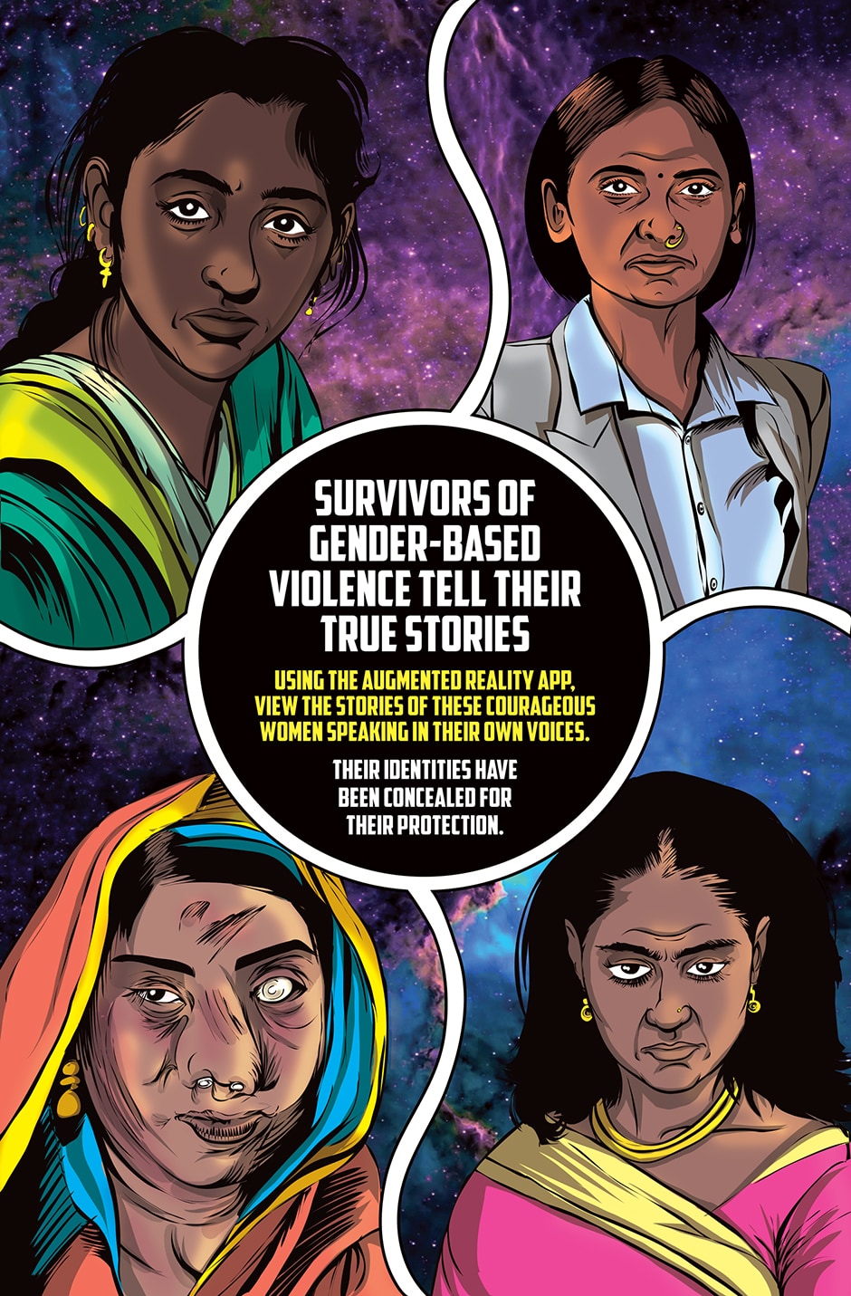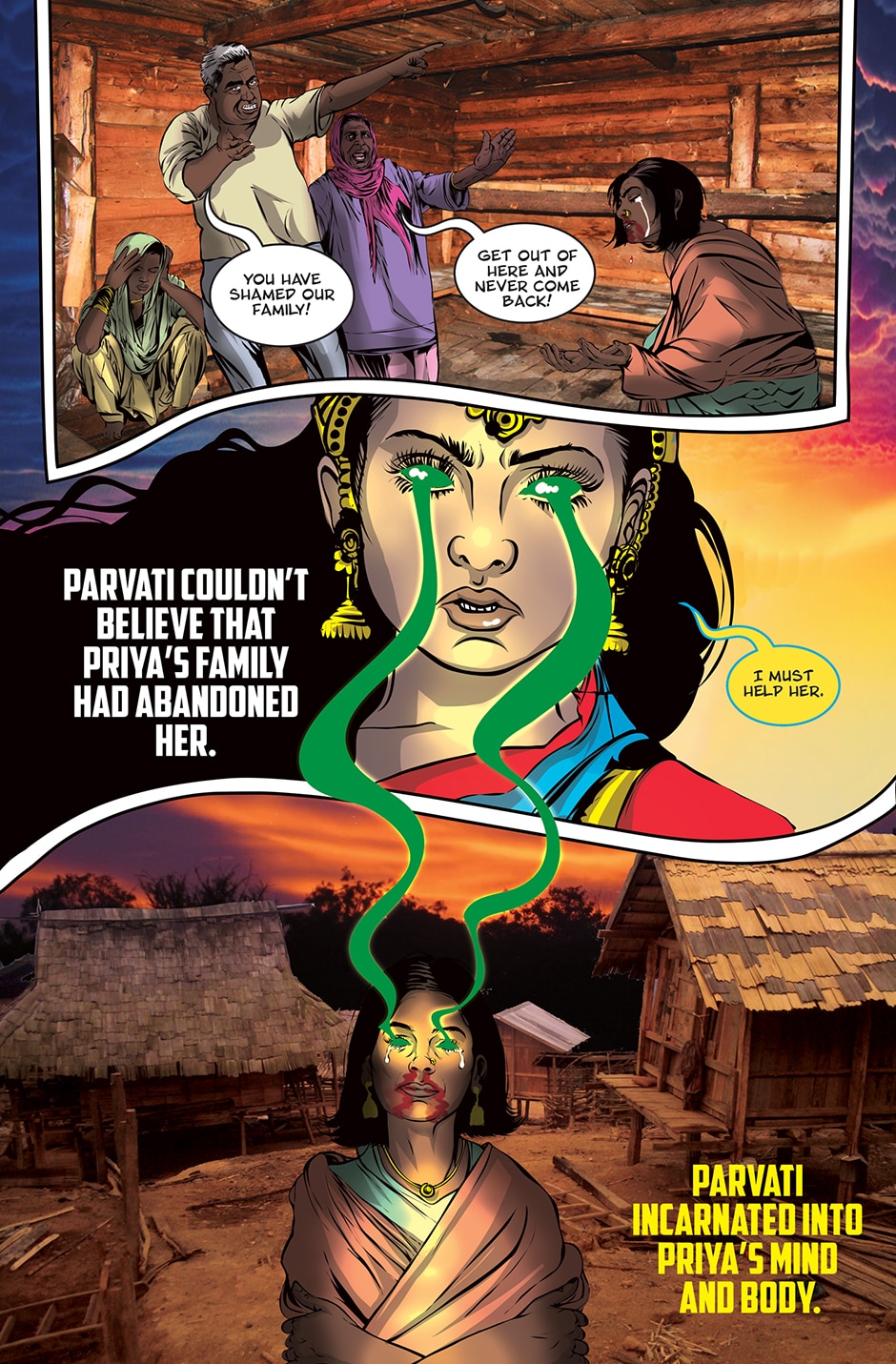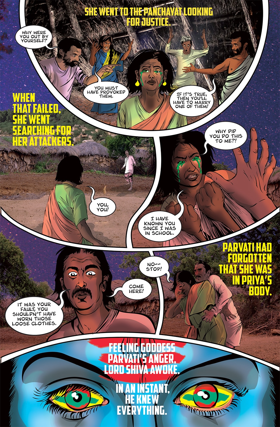 The storyline focuses on Priya, a human woman and ardent devotee of the Goddess Parvati who has experienced a brutal rape and the social stigma and isolation resulting from it. The Goddess Parvati is horrified to learn about the sexual violence that women on Earth face on a daily basis and is determined to change this disturbing reality. Inspired by the Goddess, Priya breaks her silence. She sings a message of women’s empowerment that enraptures thousands and moves them to take action against GBV around the world. This project highlights the threat of sexual harassment and violence that women face on a daily basis unless deeply rooted patriarchal norms are challenged.