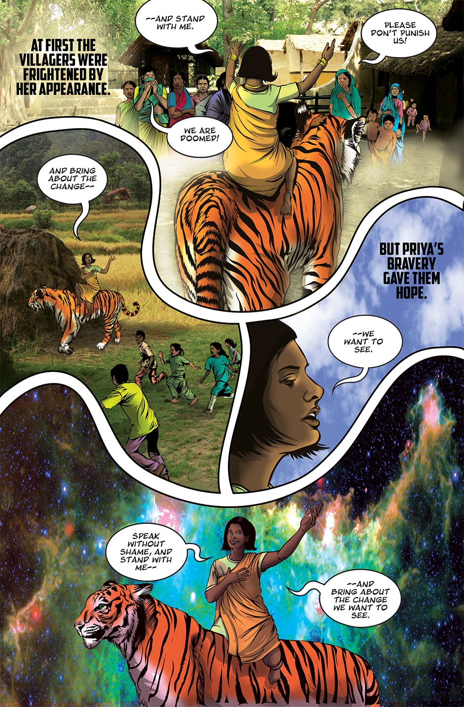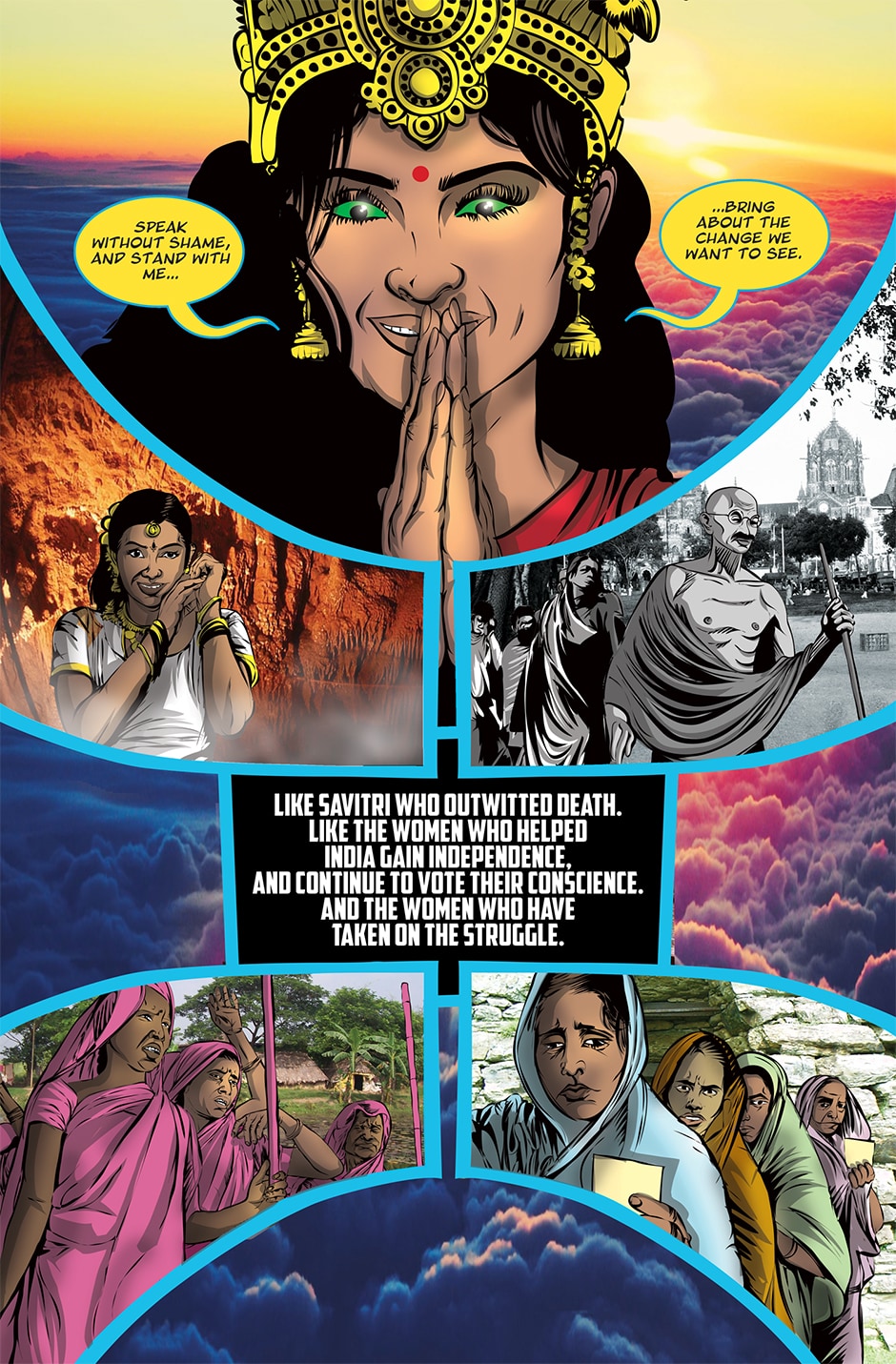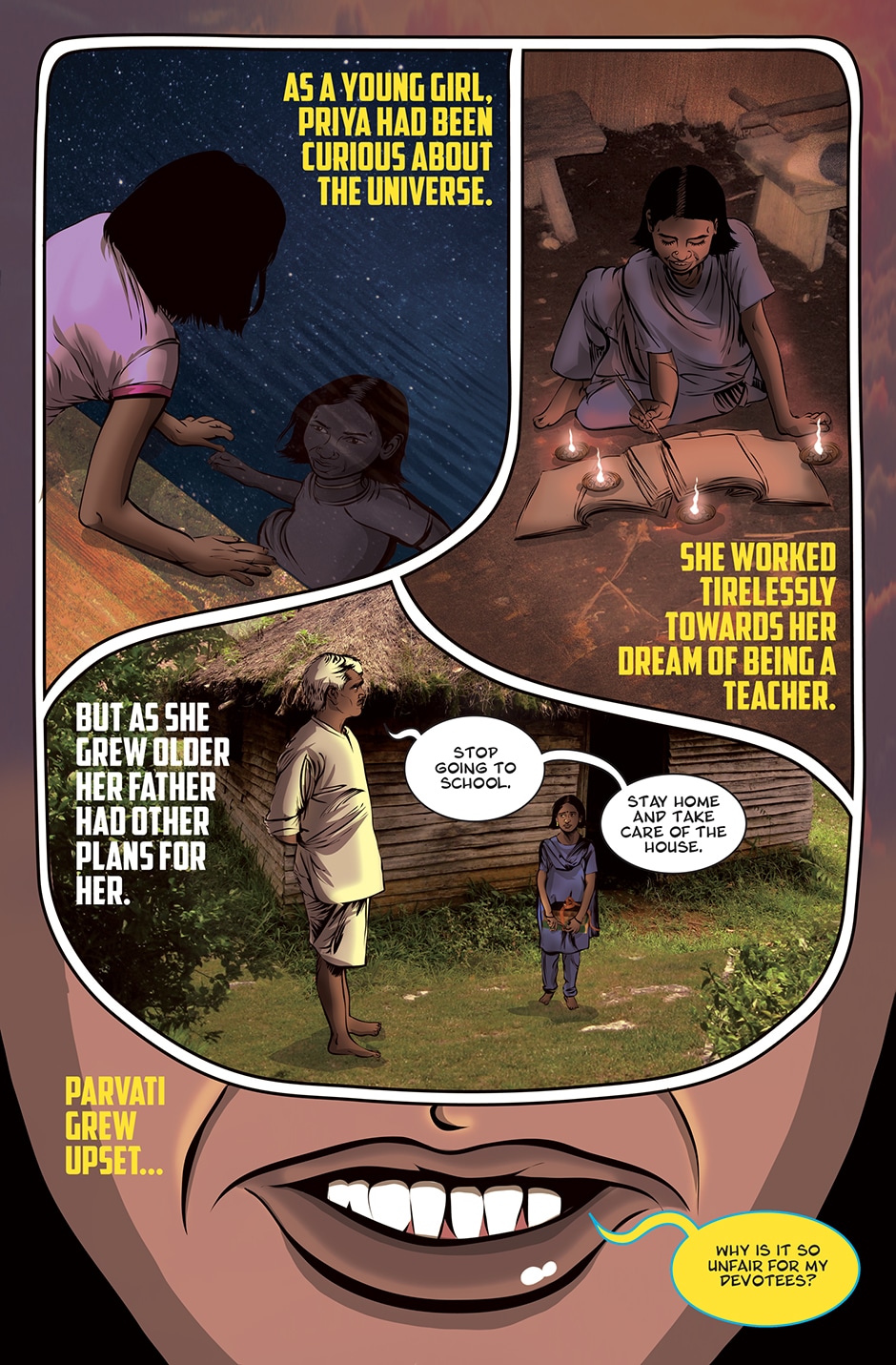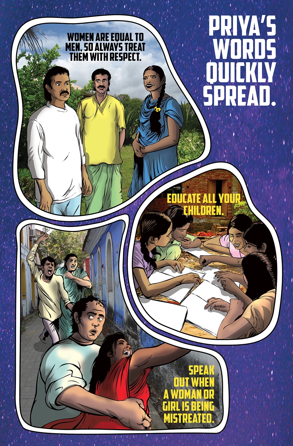 The storyline focuses on Priya, a human woman and ardent devotee of the Goddess Parvati who has experienced a brutal rape and the social stigma and isolation resulting from it. The Goddess Parvati is horrified to learn about the sexual violence that women on Earth face on a daily basis and is determined to change this disturbing reality. Inspired by the Goddess, Priya breaks her silence. She sings a message of women’s empowerment that enraptures thousands and moves them to take action against GBV around the world. This project highlights the threat of sexual harassment and violence that women face on a daily basis unless deeply rooted patriarchal norms are challenged.