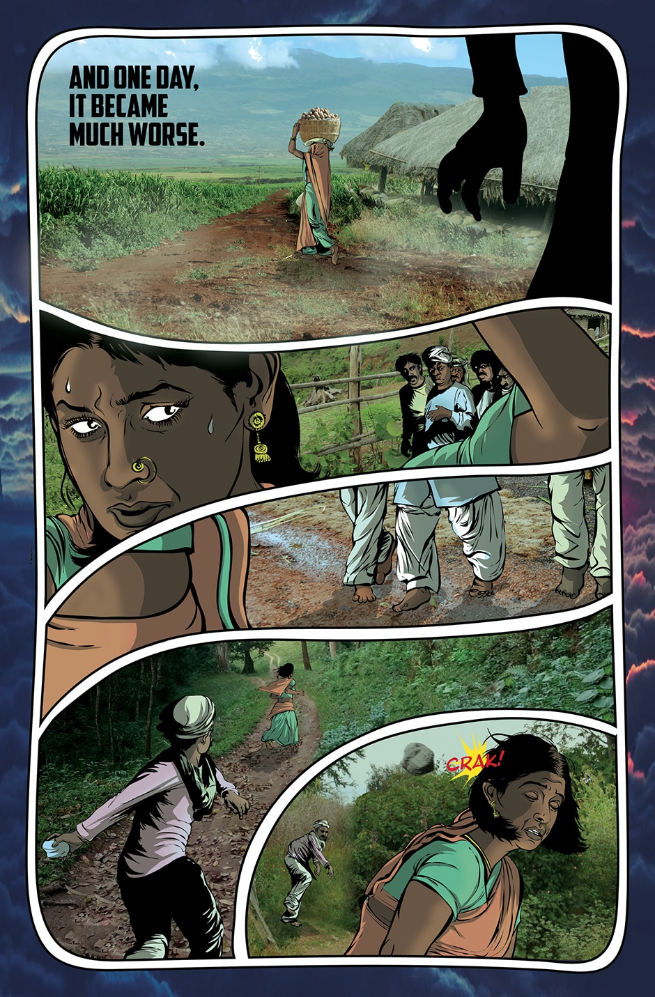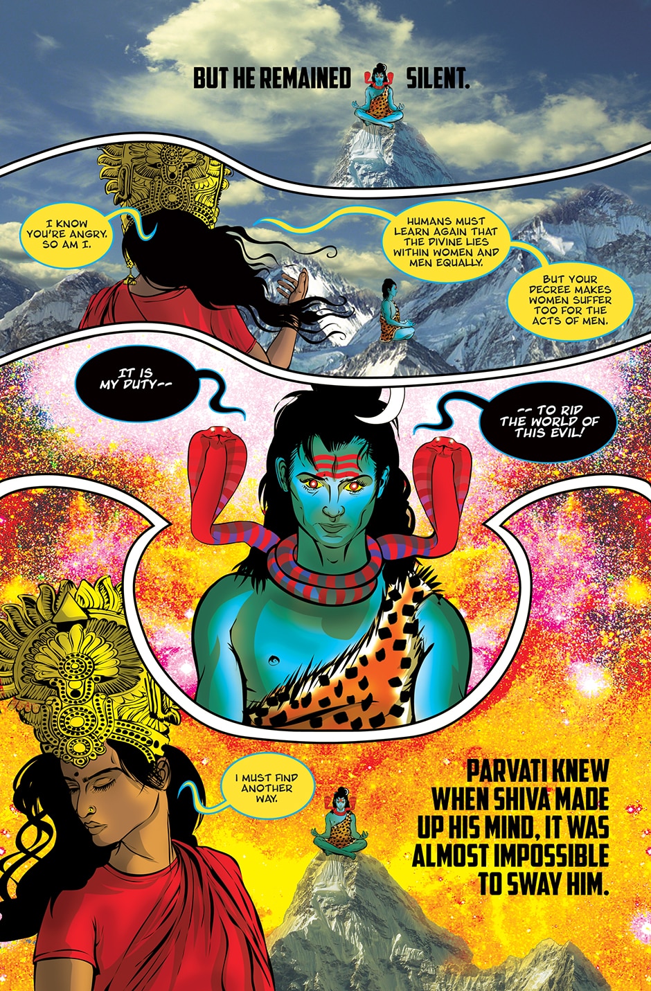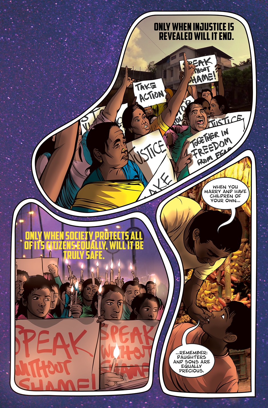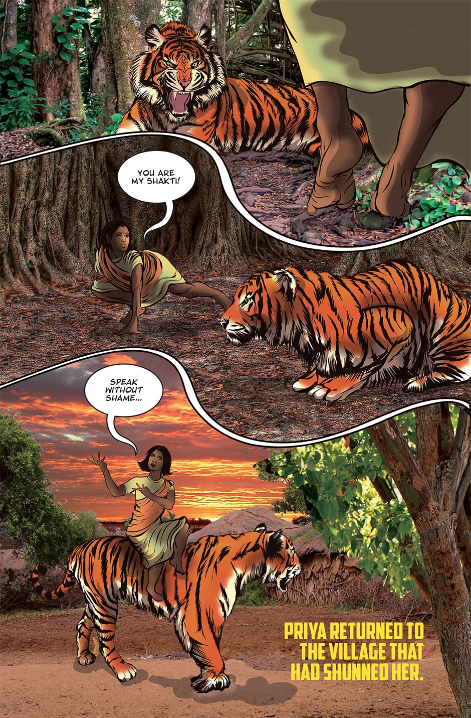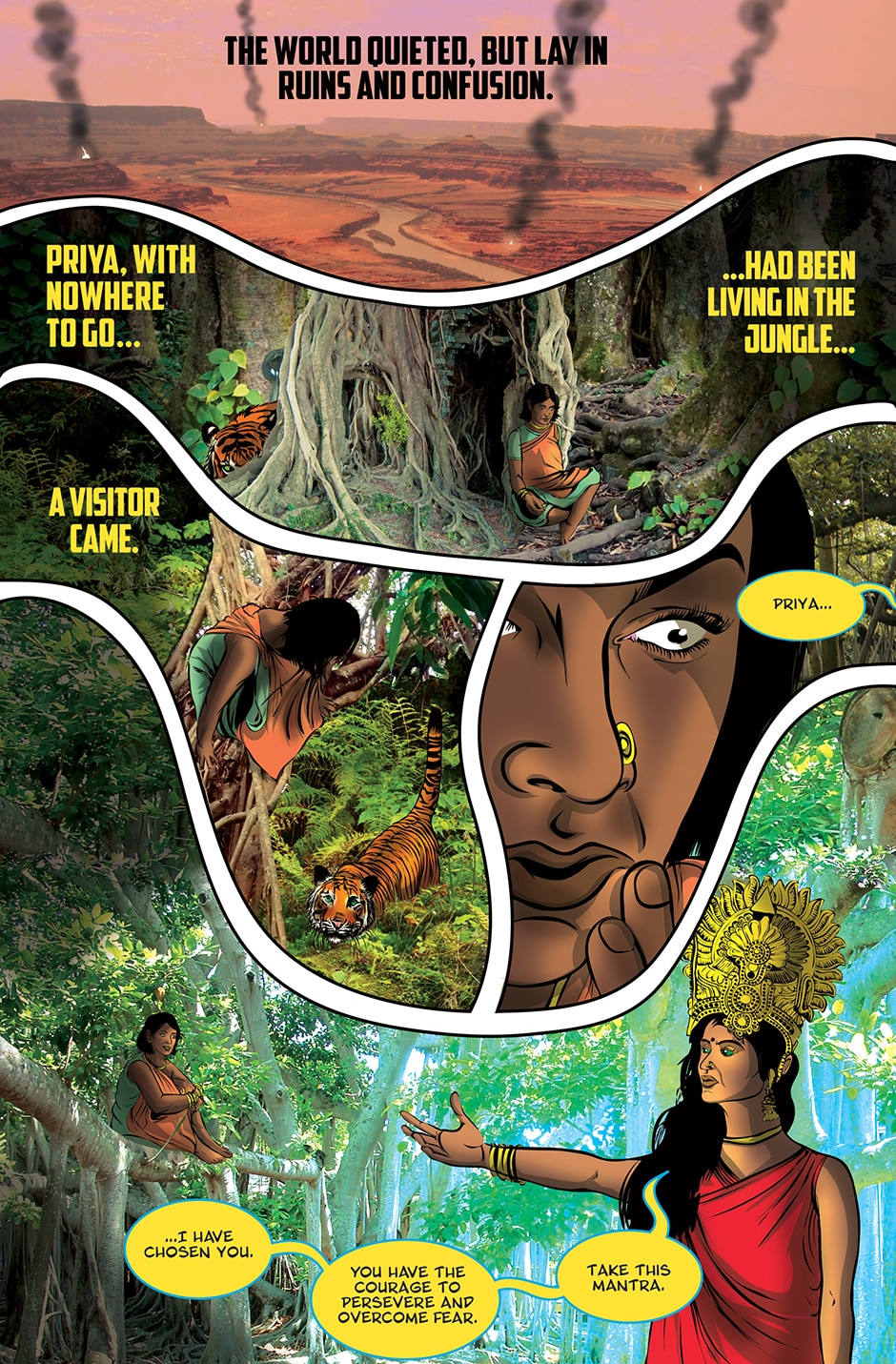 The storyline focuses on Priya, a human woman and ardent devotee of the Goddess Parvati who has experienced a brutal rape and the social stigma and isolation resulting from it. The Goddess Parvati is horrified to learn about the sexual violence that women on Earth face on a daily basis and is determined to change this disturbing reality. Inspired by the Goddess, Priya breaks her silence. She sings a message of women’s empowerment that enraptures thousands and moves them to take action against GBV around the world. This project highlights the threat of sexual harassment and violence that women face on a daily basis unless deeply rooted patriarchal norms are challenged.