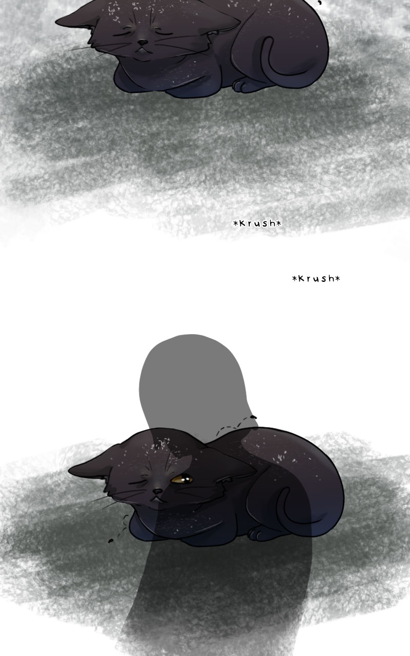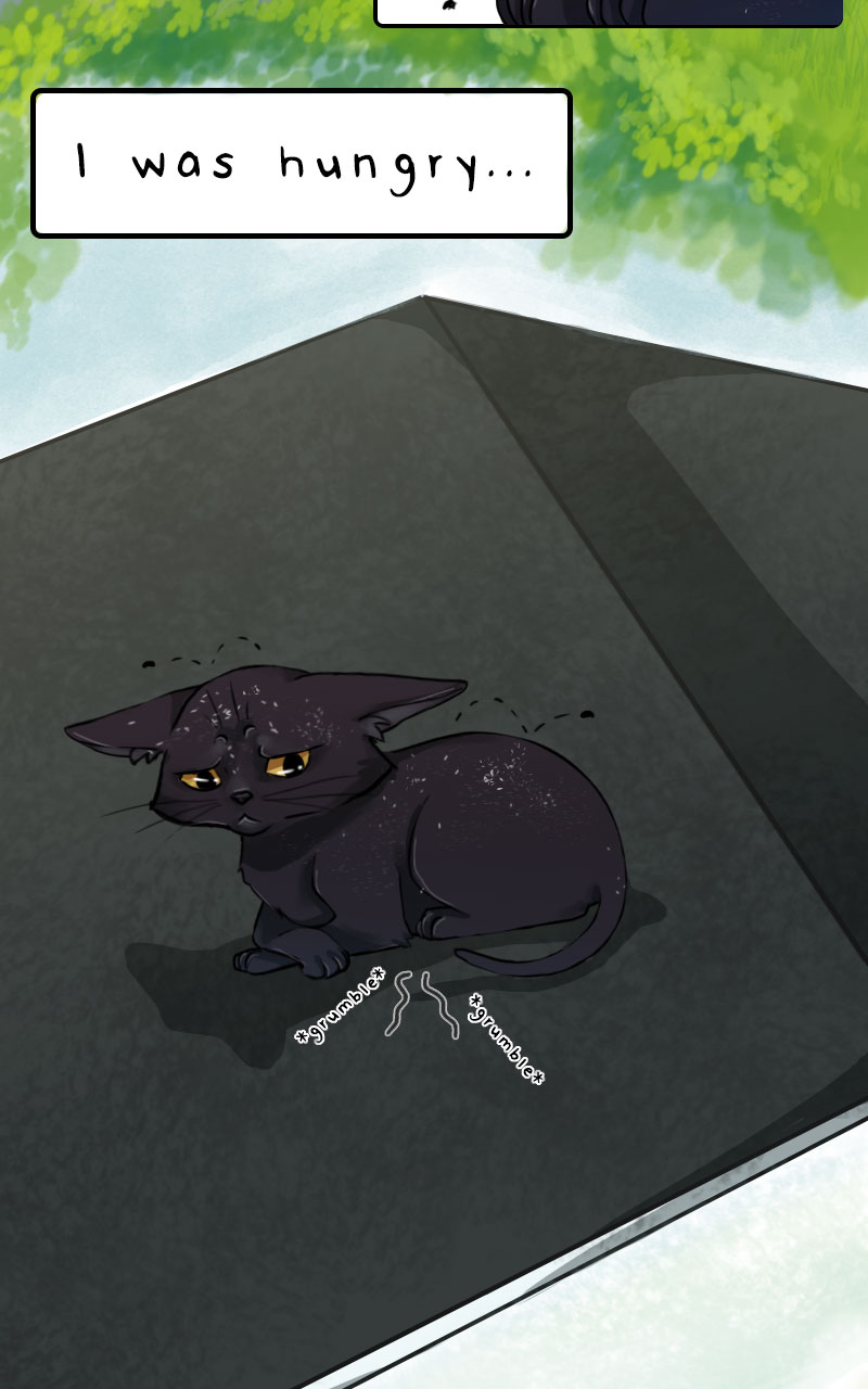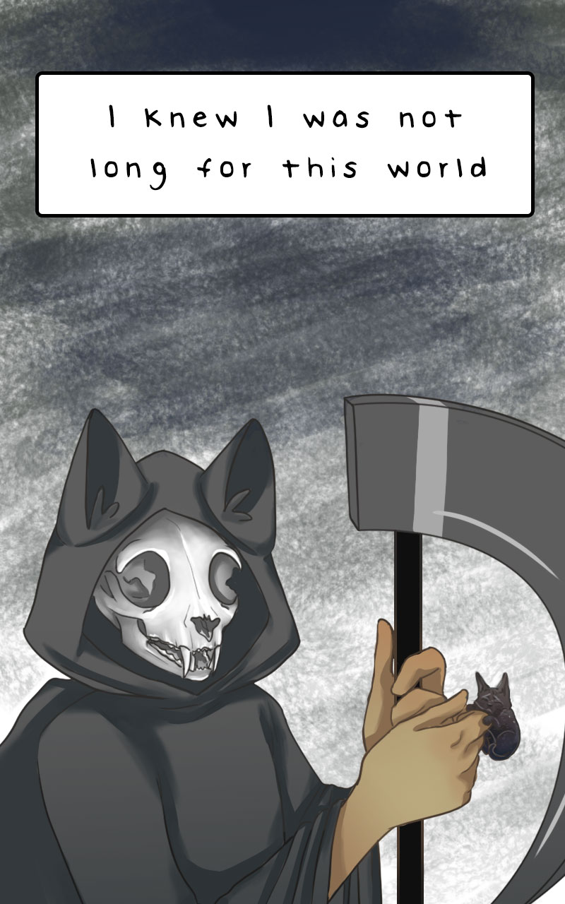 Your artwork is so beautiful and detailed. 😻 The way you drew the cat Grim Reaper was so freaking unique and creepy, I just loved it. The black kitty is so cute too. I'm so happy the girl found him.