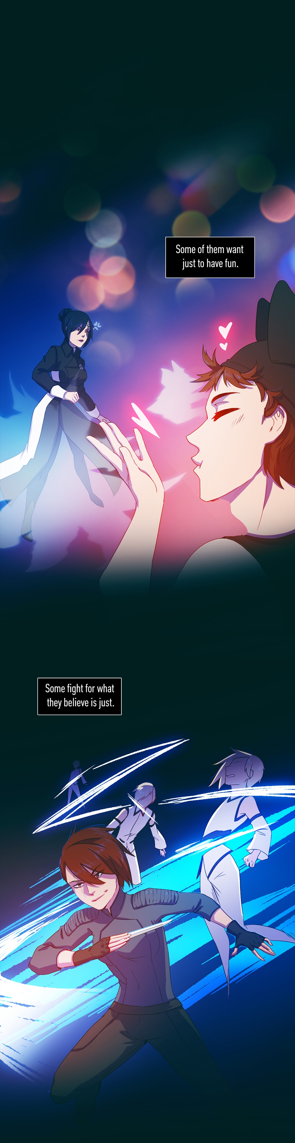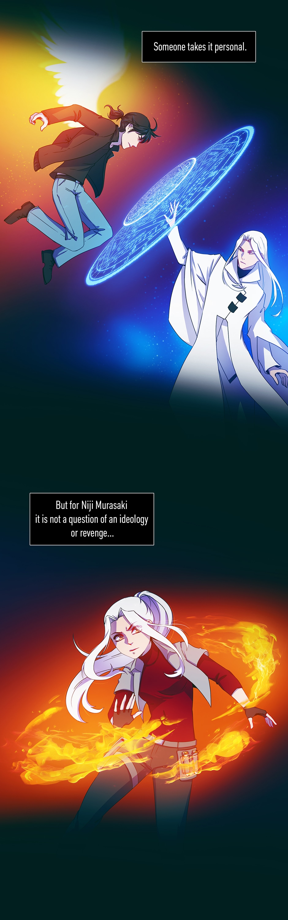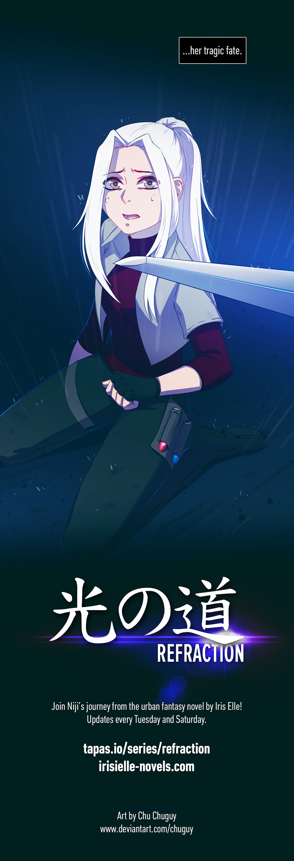 "Refraction: prologue" is a one-shot promotional webtoon created by Chu Chuguy for the light novel by Iris Elle, currently ongoing on tapas.io! Enjoy this fast-paced action story with a thoroughly crafted hard magic system, integrated into slightly futuristic world of New Tokyo.
