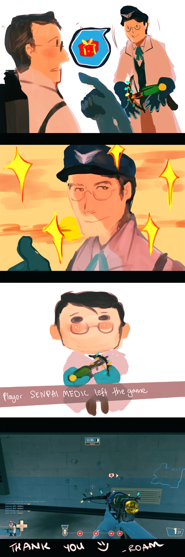 I was new to the game and played Medic class a lot. Pretty noob I guess. Then there's this older player joined the game and we both played pretty well. Spread heals, picked each other up and keep popping ubers. At the end of game he suddenly gave me a Festive Crusader's Crossbow and I was so excited because it was my first Festive. I still have that weapon in my inventory. Hope to meet him again in pubs.