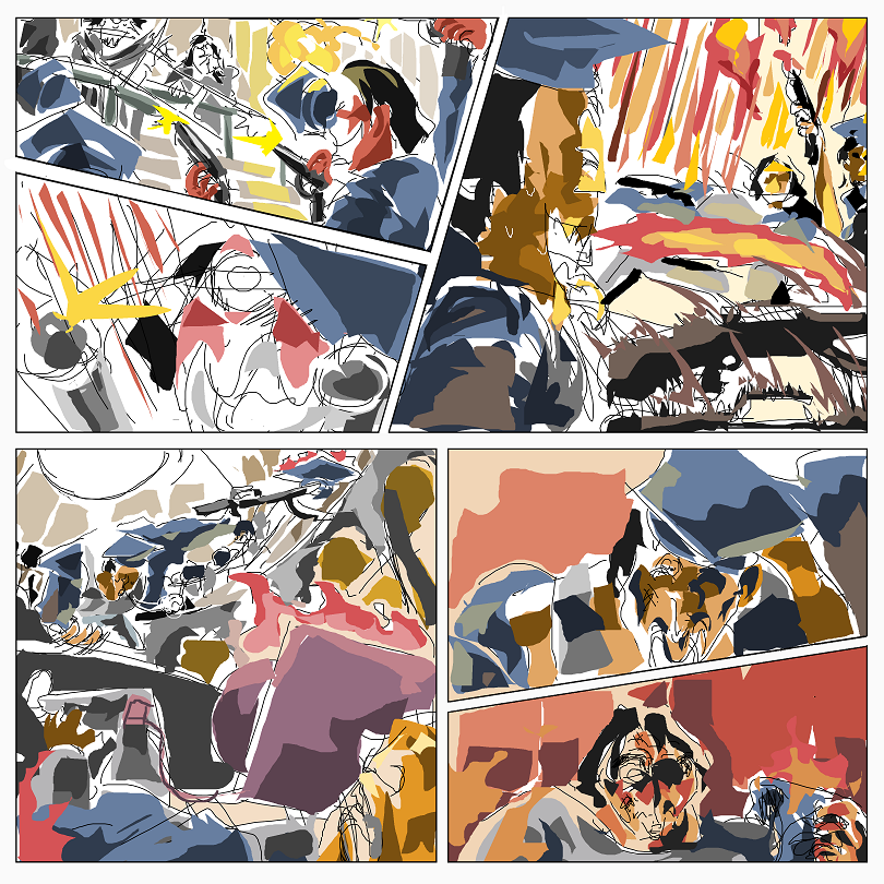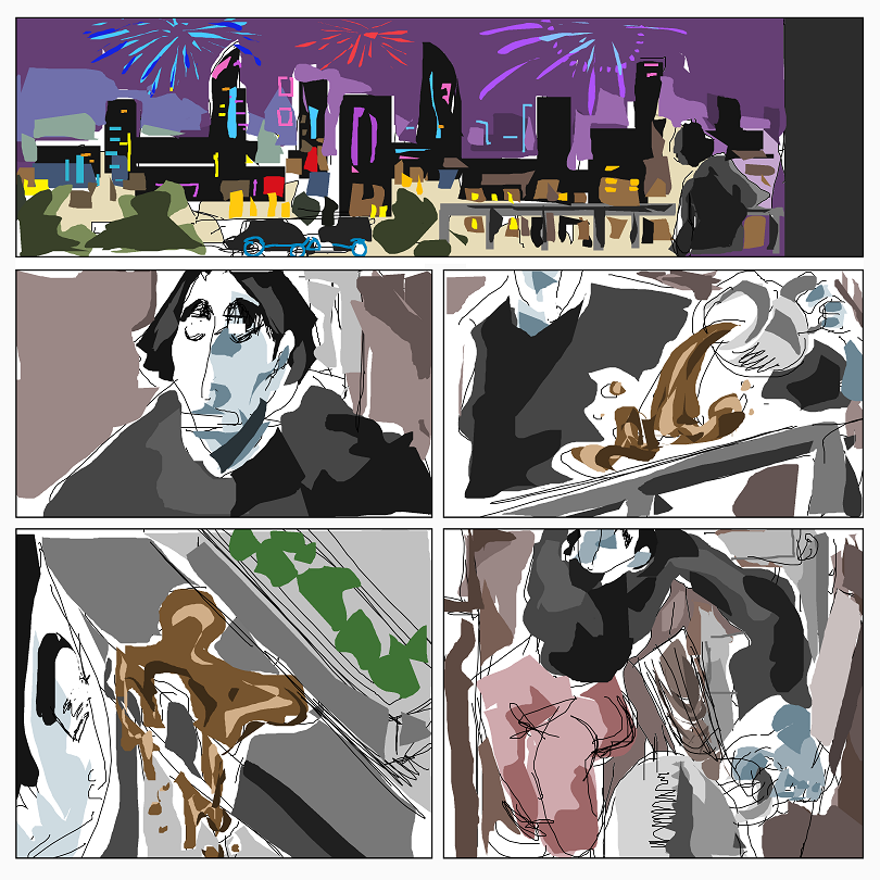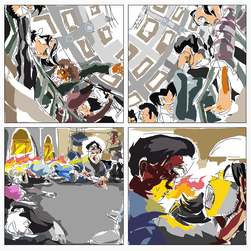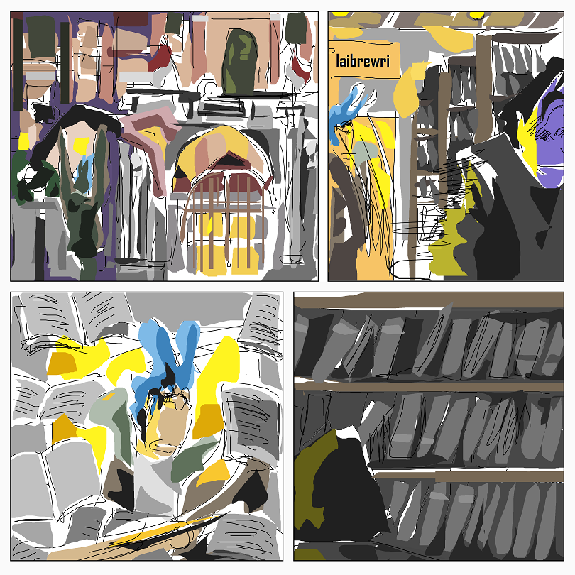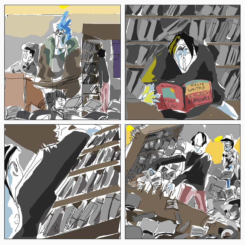 Fayer guy, in house, doing sluggishness, then being dragged into library by his colleague Fayer guy Blue.