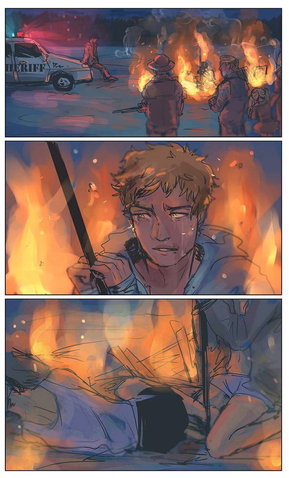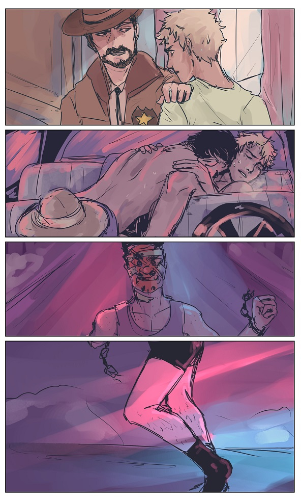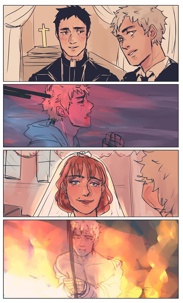 i think its about how this man (the blonde) marries a woman and begins to have affairs with the townsfolk till he finally sleeps with the priest and people decide that enough and when they find out (the priest and the man) try to run off but are captured and burned for their sin but as they watch them burn they feel guilty and wonder if they should have been the ones to burn as well since they all slept with the guy