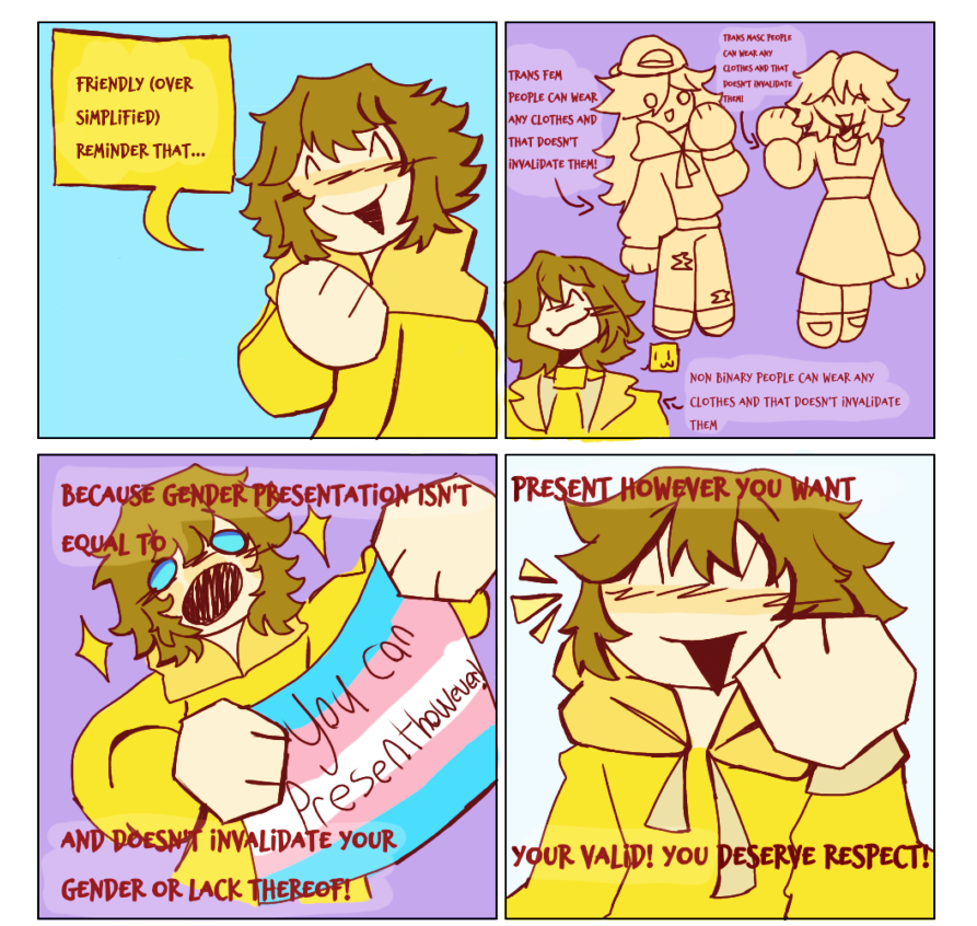 Just a reminder that you are valid and you deserve respect! I put the over simplified thing because it's hard to explain the history of gender rolls, expression ectand stuff in a silly 4 Panel comic lol! But I hope everyone gets the point that they deserve respect!!