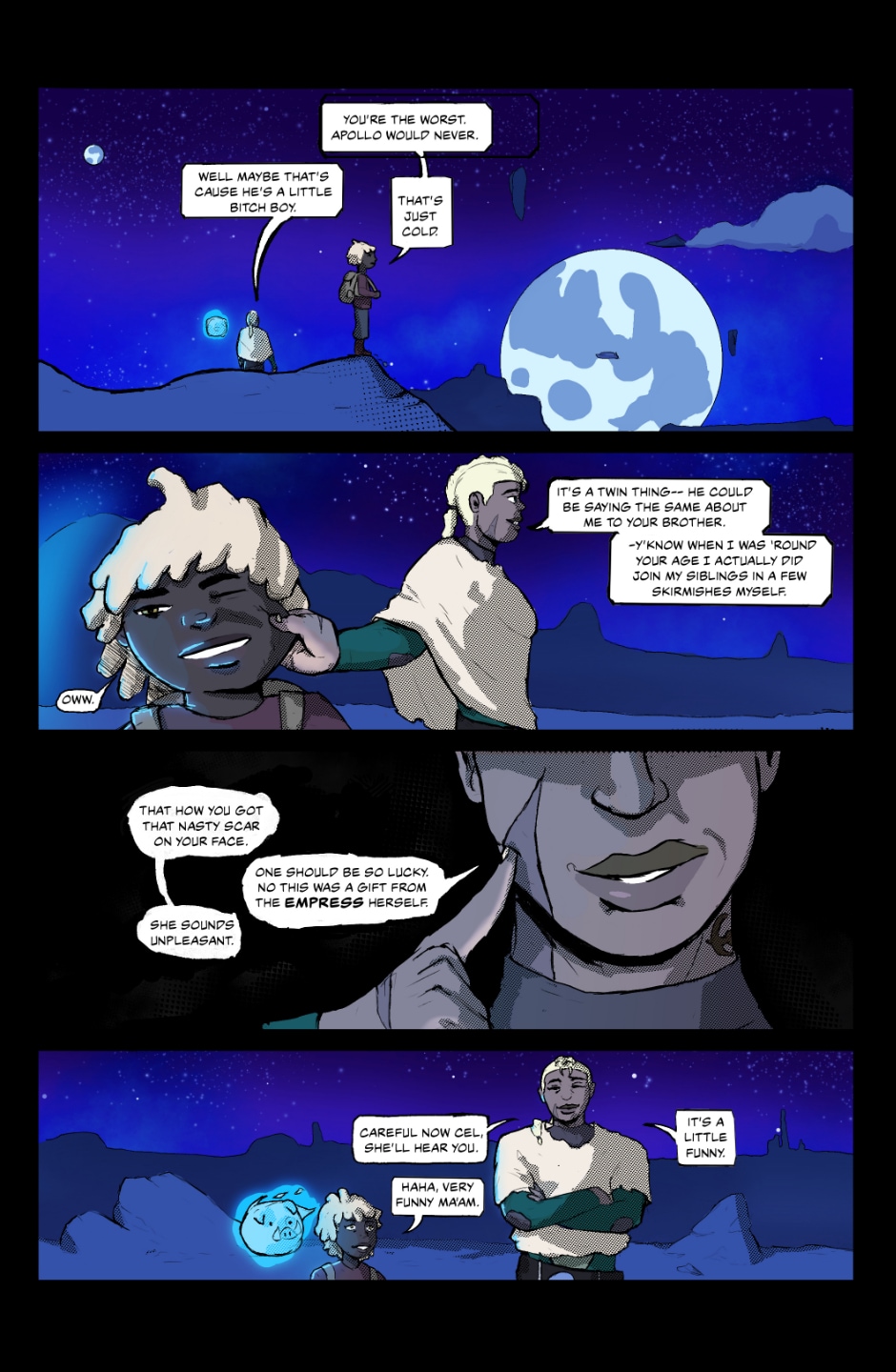 After years of service on the Olympian homeworld, Celeste managed to escape that life in favor as a new one as an average venator. Venators are bounty hunters employed by the Nenarei Republic to handle targets they deem enemies of intergalactic peace. Now that Celeste is one of them, she makes a living going from planet to planet on her ship The Luna with her navigator Havi an Aesir prince and Radha an old drone from back home.
