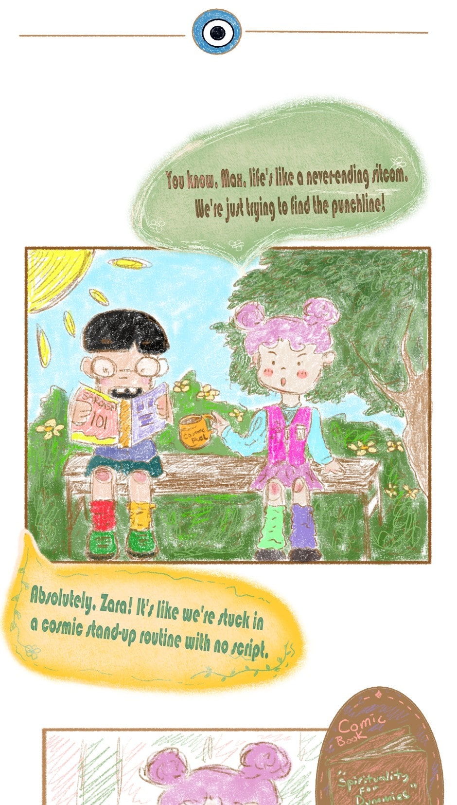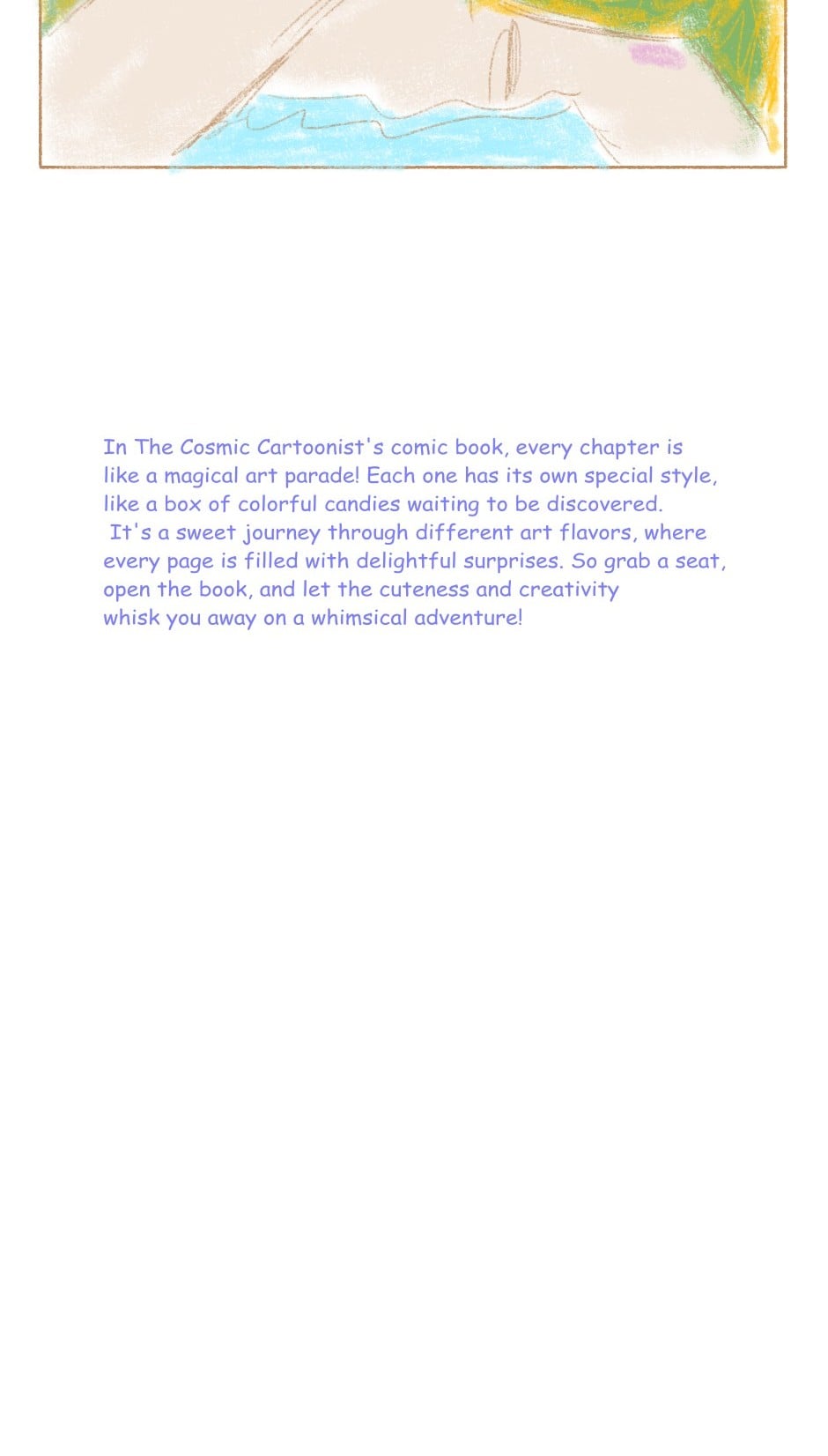 In The Cosmic Cartoonist's comic book, every chapter is like a magical art parade! Each one has its own special style, like a box of colorful candies waiting to be discovered. It's a sweet journey through different art flavors, where every page is filled with delightful surprises. So grab a seat, open the book, and let the cuteness and creativity whisk you away on a whimsical adventure!