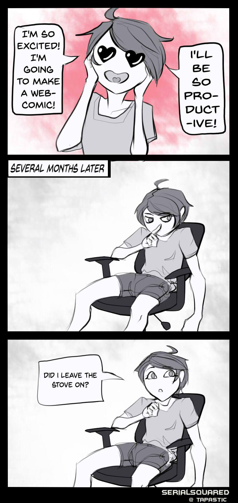 tfw you're super excited to create a webcomic.... and then you get super excited to make a different webcomic.... and then suddenly it's a year later and you still haven't done anything