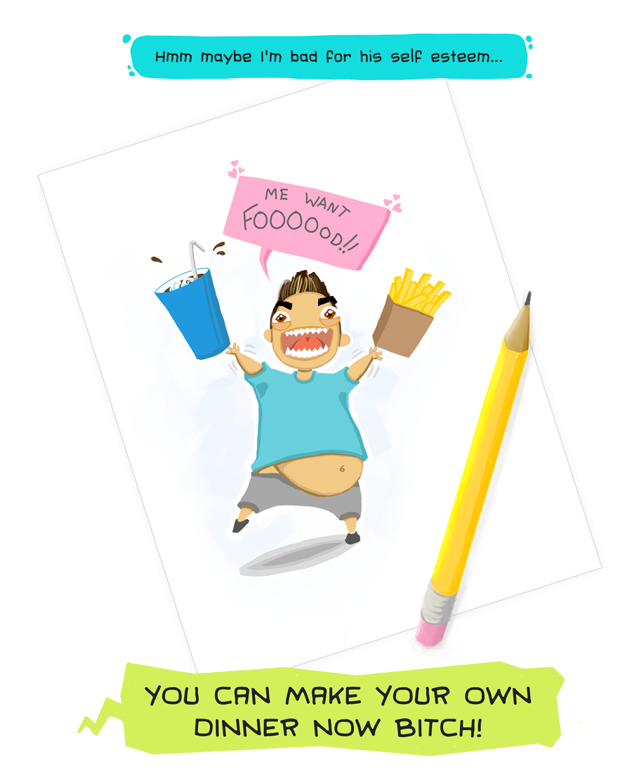 Hahaha the first thing I thought of when I saw 'me want food' was Jenna Maroney from that one episode of 30 Rock. Nice use of colours btw :)
