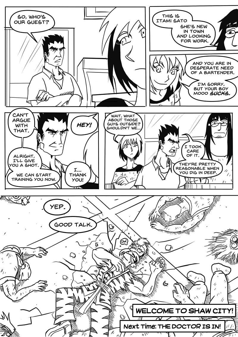 Shaw City--home of the world's greatest warriors. It's also the new home of Itami Sato, on a quest to become a world-class action heroine, and Mooo, a gentle giant studying an ancient and deadly form. Their legend begins NOW!