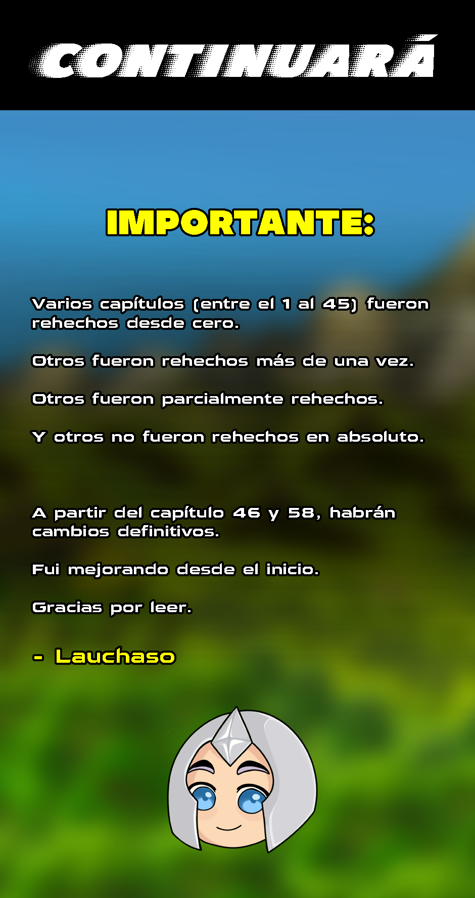 Debido a un problema de por vida causado por una condición de nacimiento, a partir del capítulo 46 en adelante todos mis dibujos serán 100% digitales. Ya no puedo traer dibujos en formato tradicional como siempre me gustó.