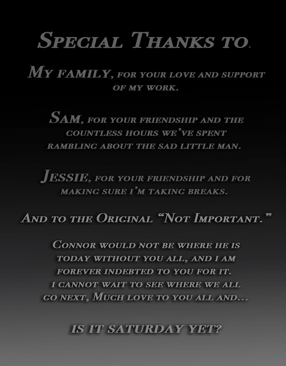24 years old and solidly residing at rock bottom, Connor is a young sorcerer who has only been left with haunted memories and a need for revenge on those who orchestrated his own downfall. After being on his own for 8 years, Connor is taken in by a fellow group of travelers known as "Not Important", but in doing so he must control his ever growing powers, keep a hidden affliction under wraps, and deal with the ever present ghost of his Father.