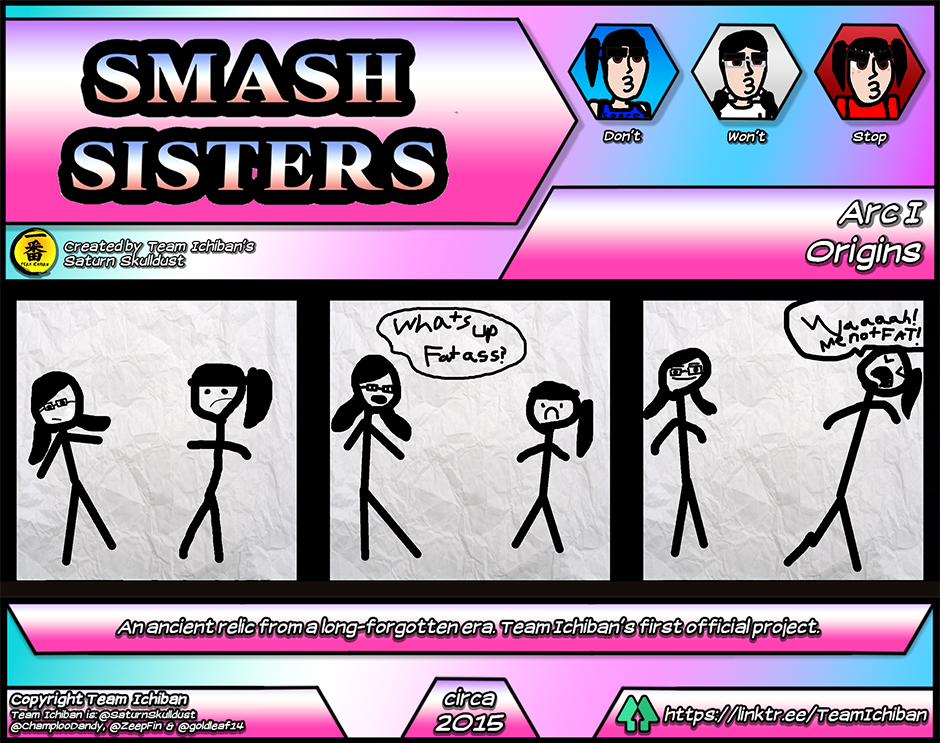 Smash Sisters! is the first webcomic ever created by Team Ichiban's Saturn Skulldust. This strange, pseudo-canon "prequel" to Kureiji Yababa!!! (Classic) is now coming to Tapas! Smash Sisters! stars the Ryujima sisters' predecessors, the Higashikata girls. Confronted by the evil machinations of their crotchety old neighbors, its up to them to bring peace back to their sleepy hometown.