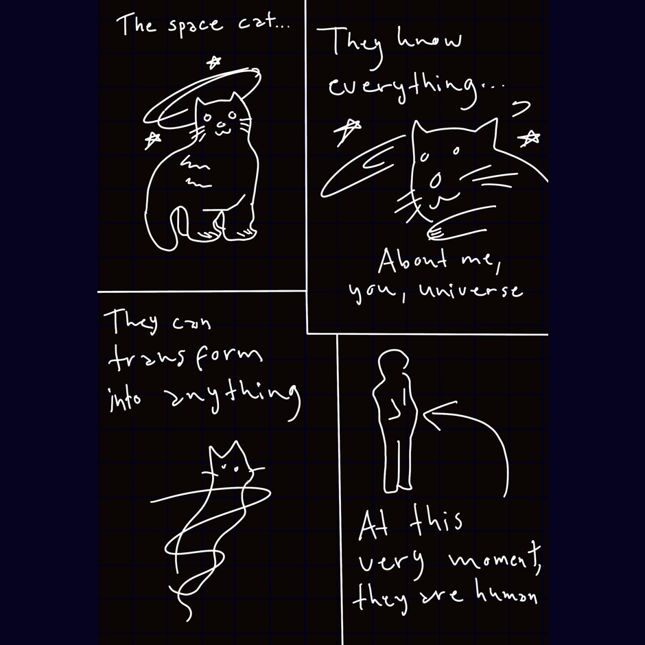 There's a legend saying that a savior will return some day to save the universe. That savior is the Space Cat. It is said that they know everything, but the truth is that they don't.