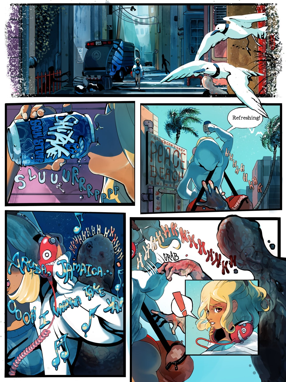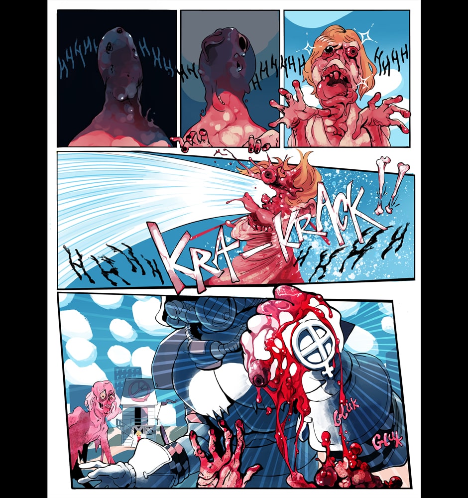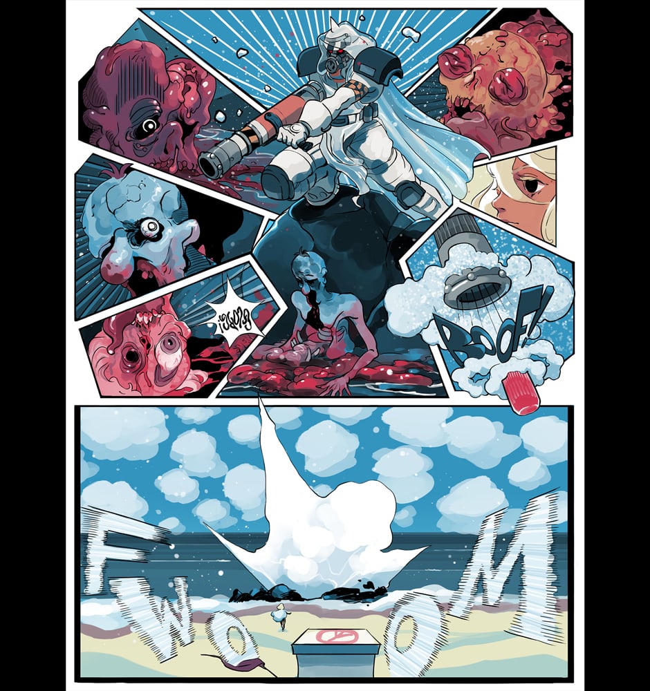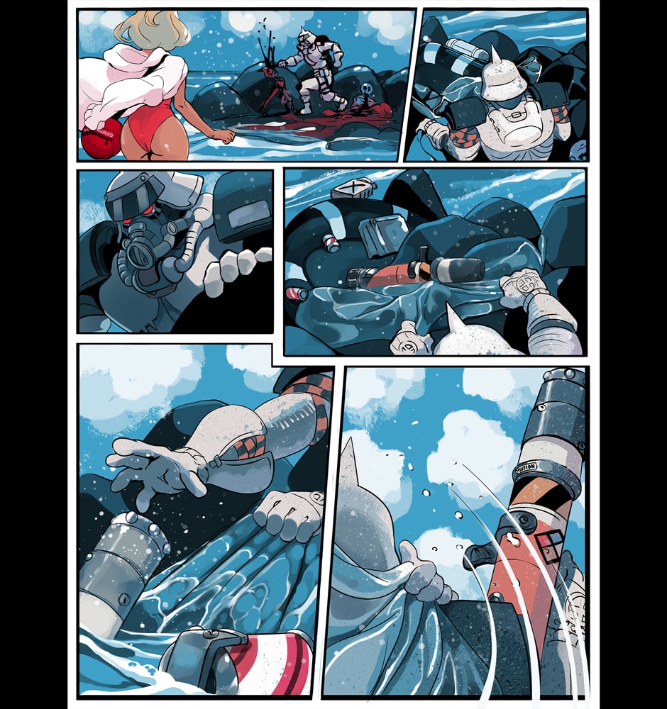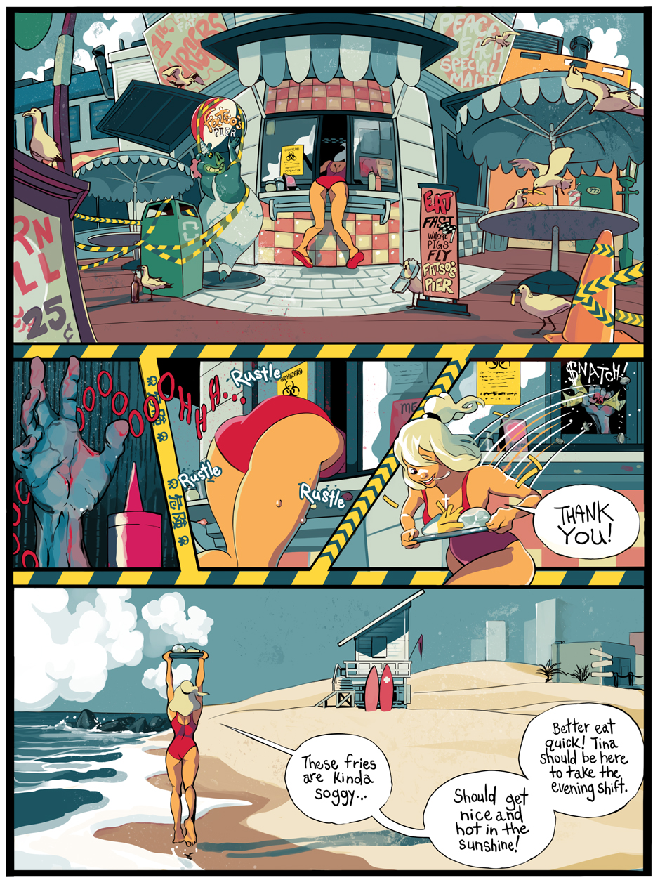 A ditzy lifeguard and an armored killing machine take on swarms of undead in this colorful twist on a zombie beachpocalypse. Can Bone the super soldier escort his doe-eyed, haphazard partner to safety in one piece, or will opposing forces, both living and dead, try to take everything from them?