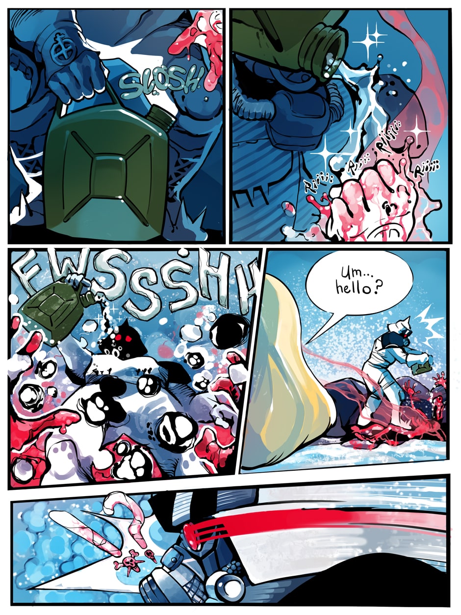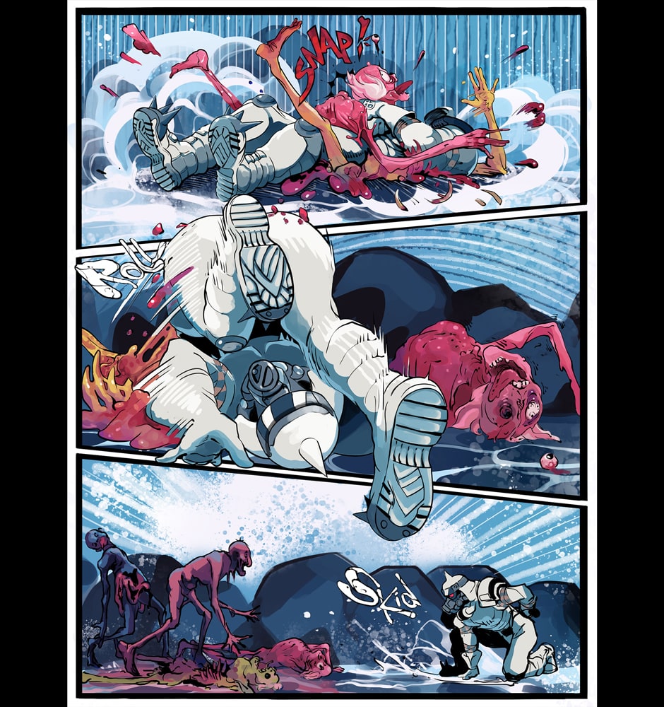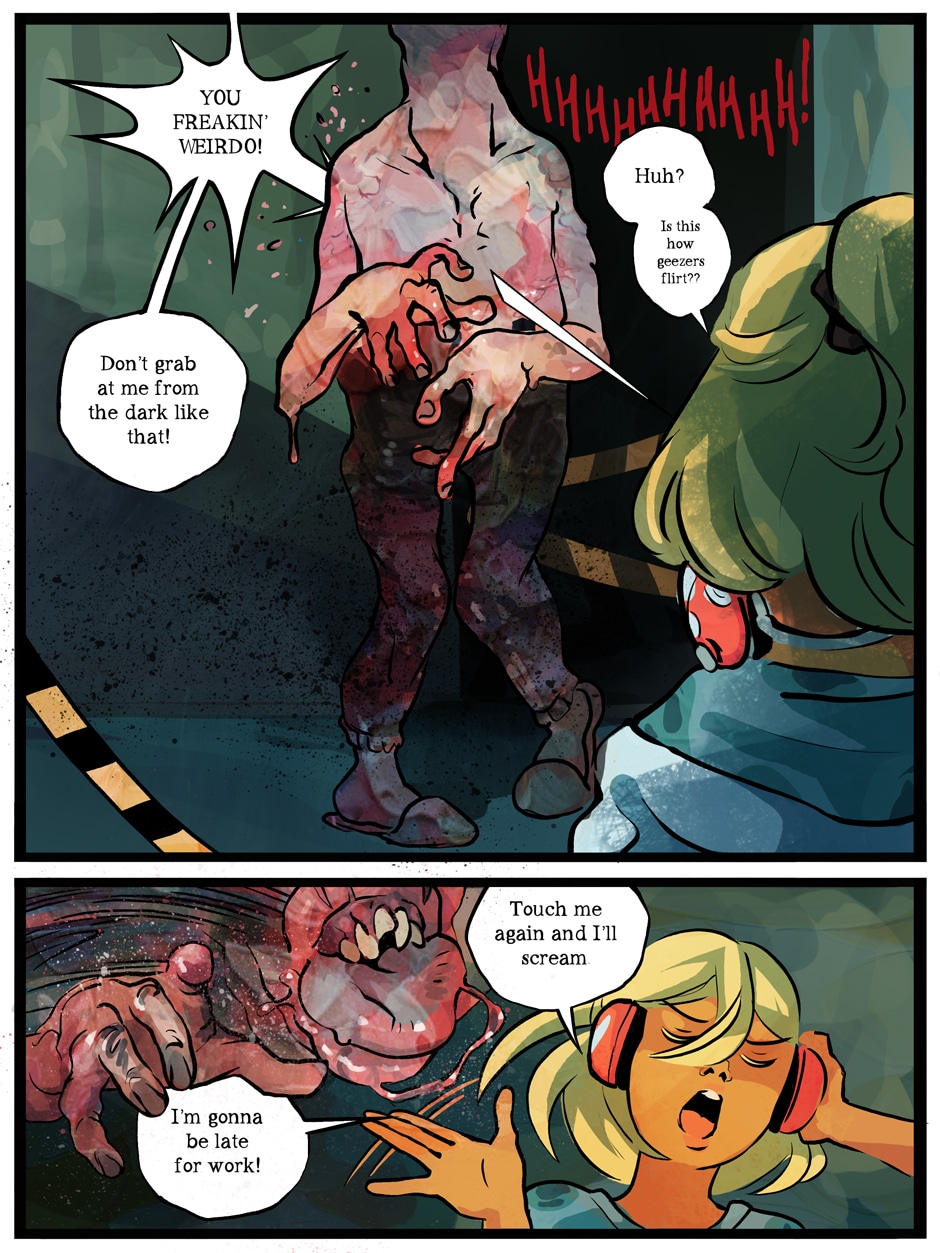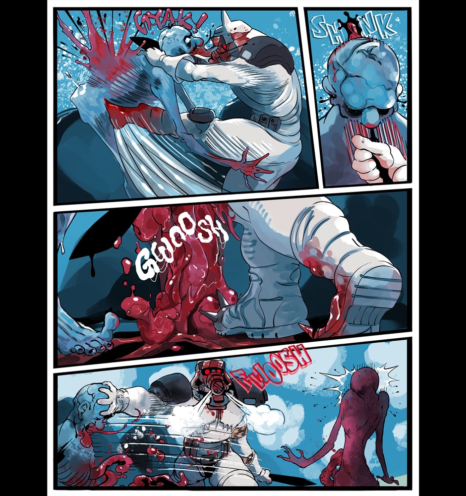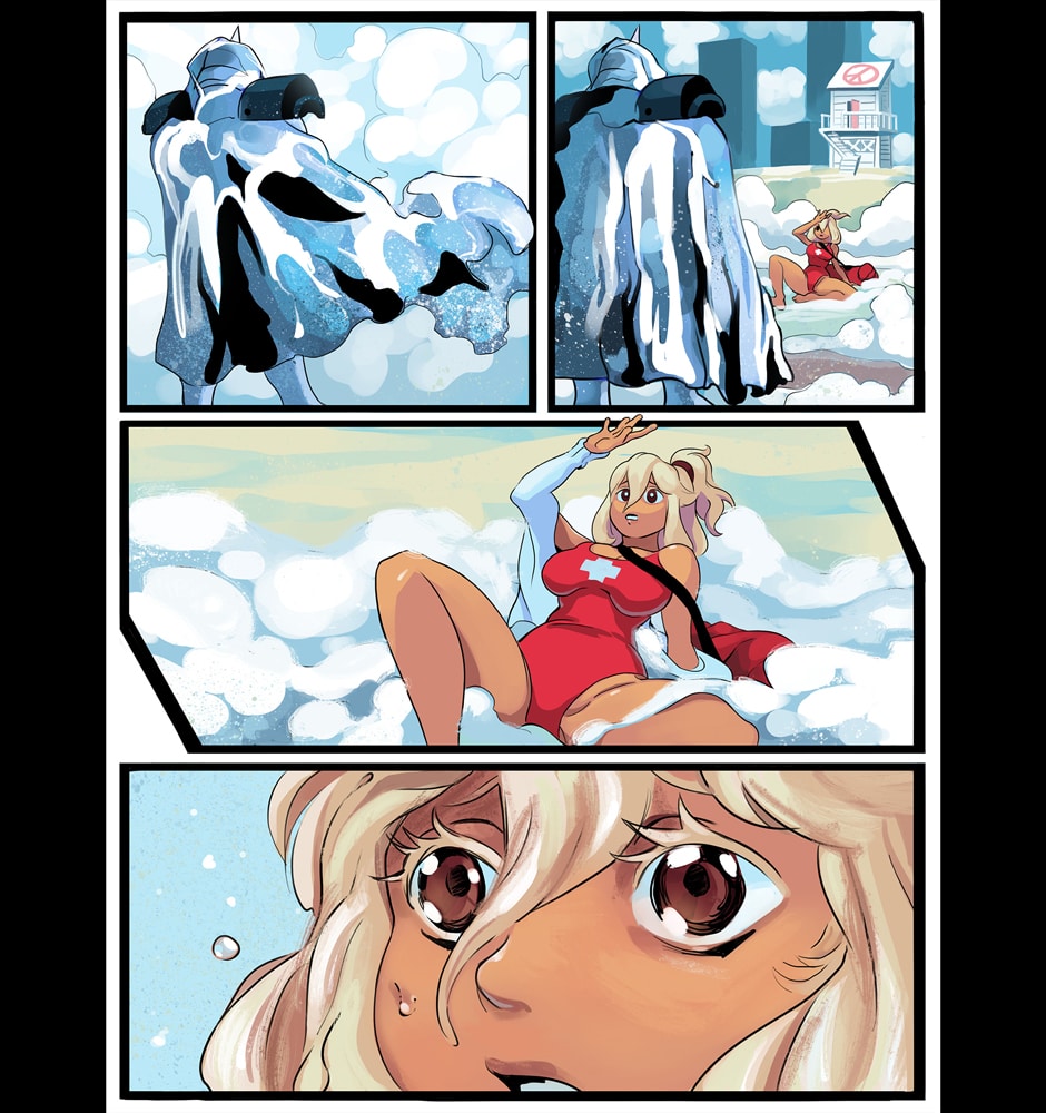 A ditzy lifeguard and an armored killing machine take on swarms of undead in this colorful twist on a zombie beachpocalypse. Can Bone the super soldier escort his doe-eyed, haphazard partner to safety in one piece, or will opposing forces, both living and dead, try to take everything from them?