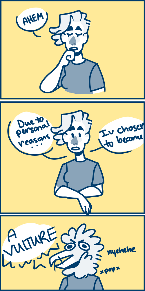 Spoons is a slice of life comic about, well, my life. There'll be talks about growing up depressed, going to a weird school, and self discovery (because what else are you supposed to put in these?) Some will be serious, but most not so much.