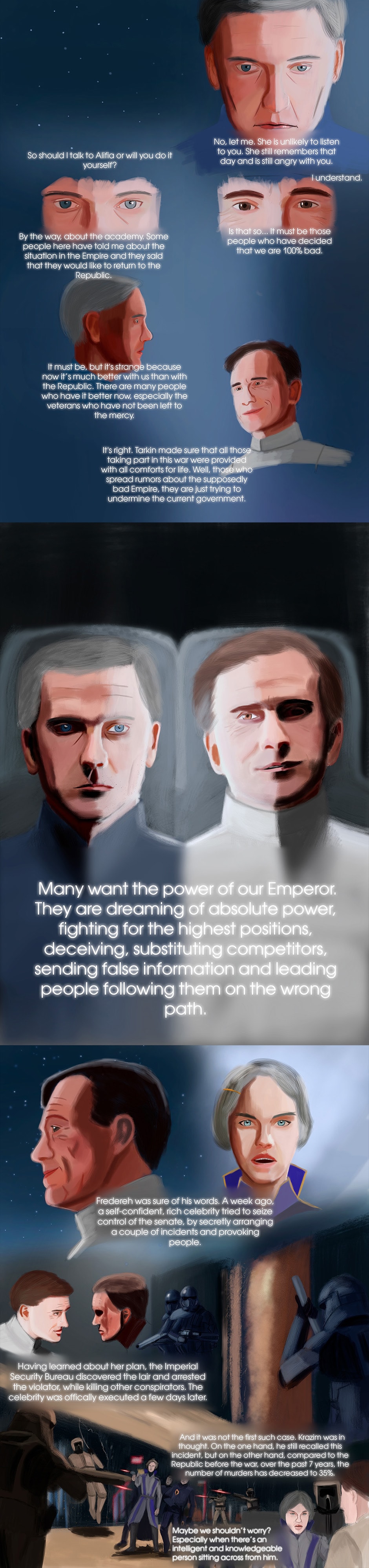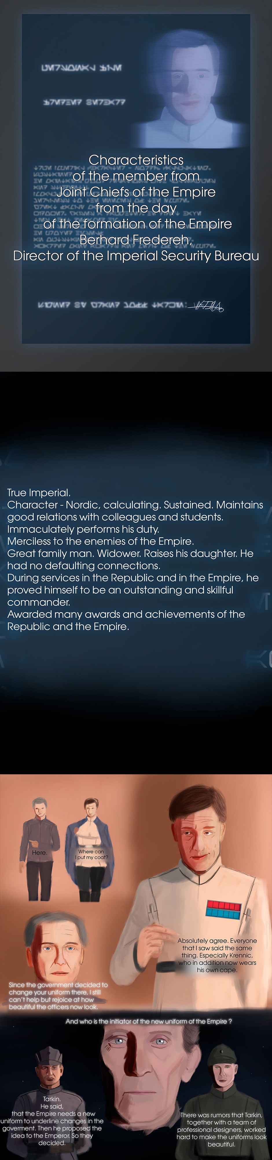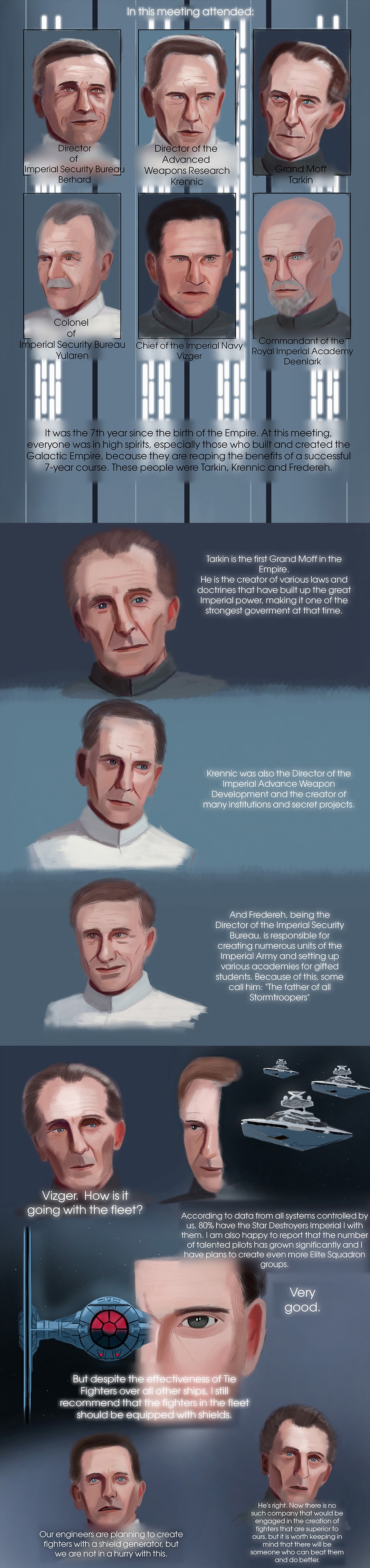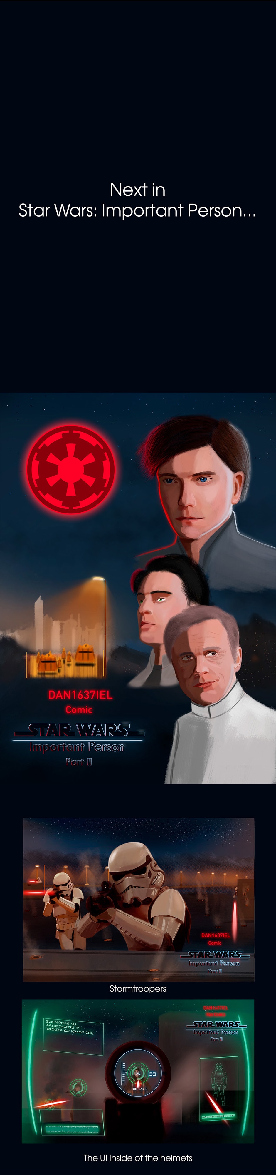 Star Wars: Important Person is a Epic Saga Fan Comic that all events are happening in a different SW universe, but with characters, vehicles, events, planets, rules and other things that I created myself, that was in Expanded Universe and Nowadays Canon. This comic tells an adventure of characters from the Galactic Empire. In Important Person, you will witness heroism, the cruelty of wars, friendship, love, suffering, loss, different perspective, and stories of characters.